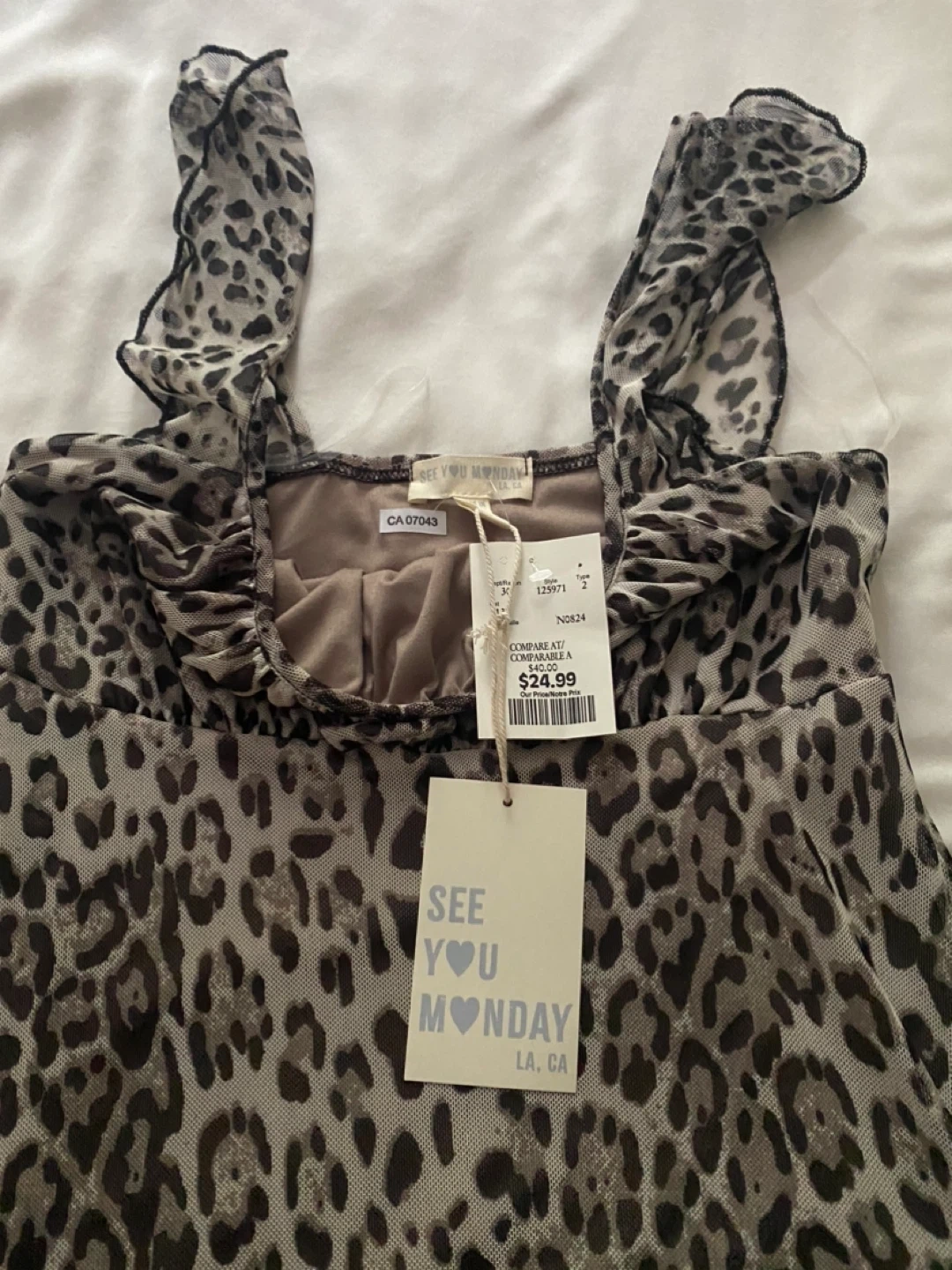 10Selling a cute See You Monday dress with a fun leopard print! It's in great condition and ready for a new home. The dress features ruffled straps and a flattering fit. Originally bought for $24.99