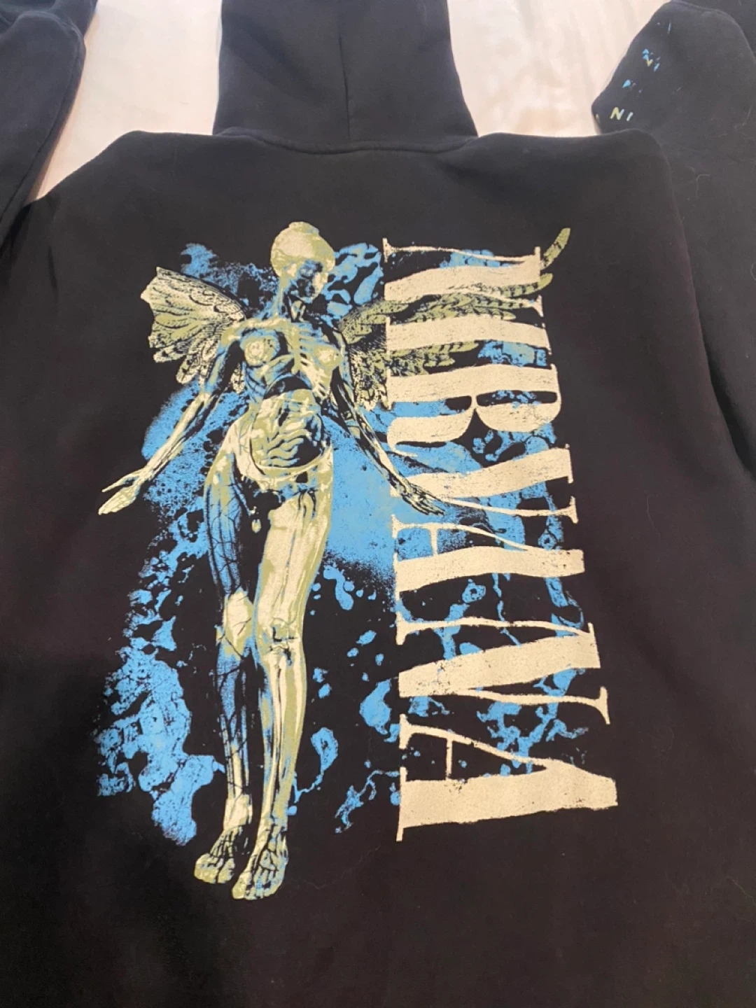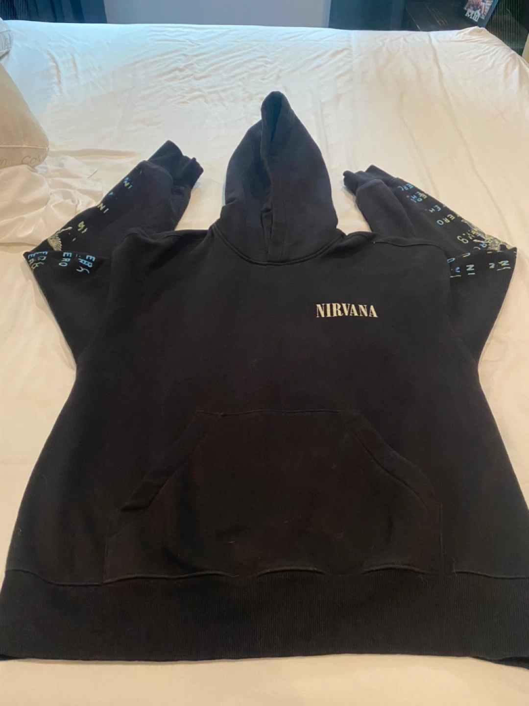 10Selling a black Nirvana hoodie. It features the band's name on the front and a unique design on the back. Great for any Nirvana fan! Size Medium from H&M
