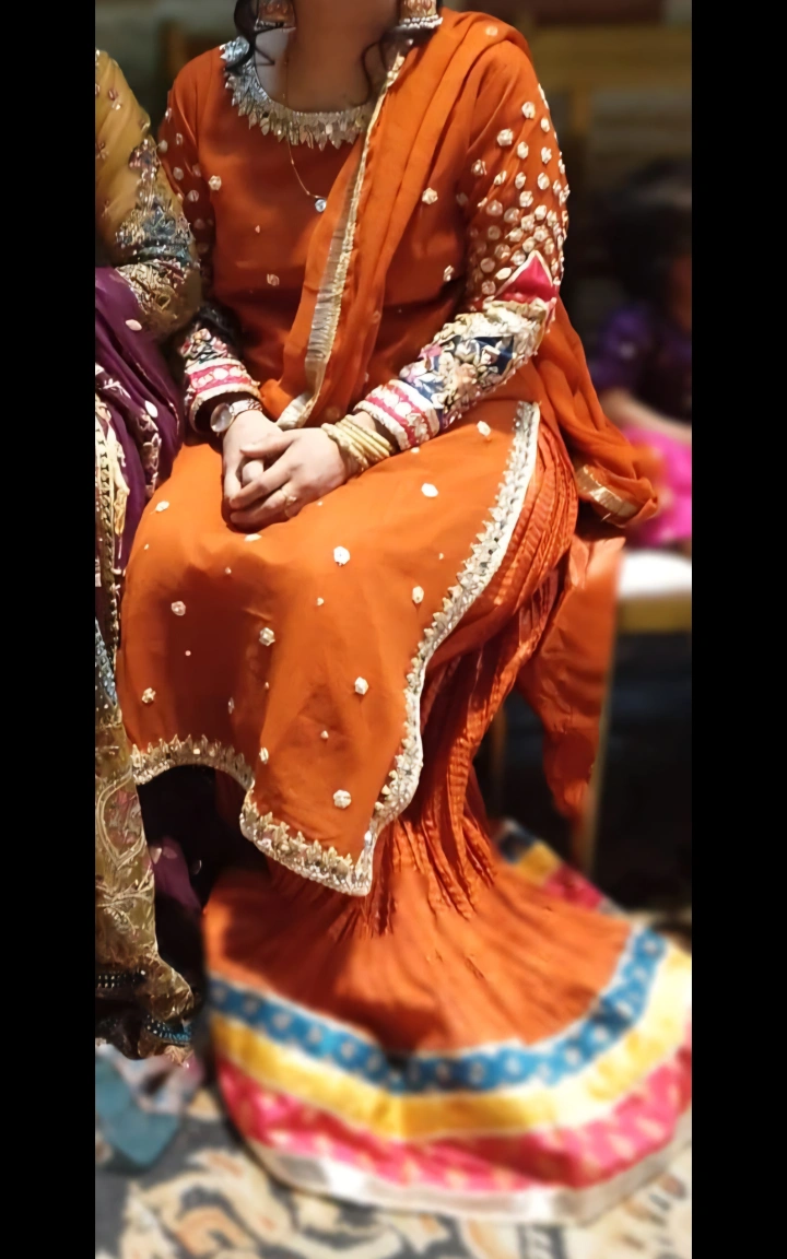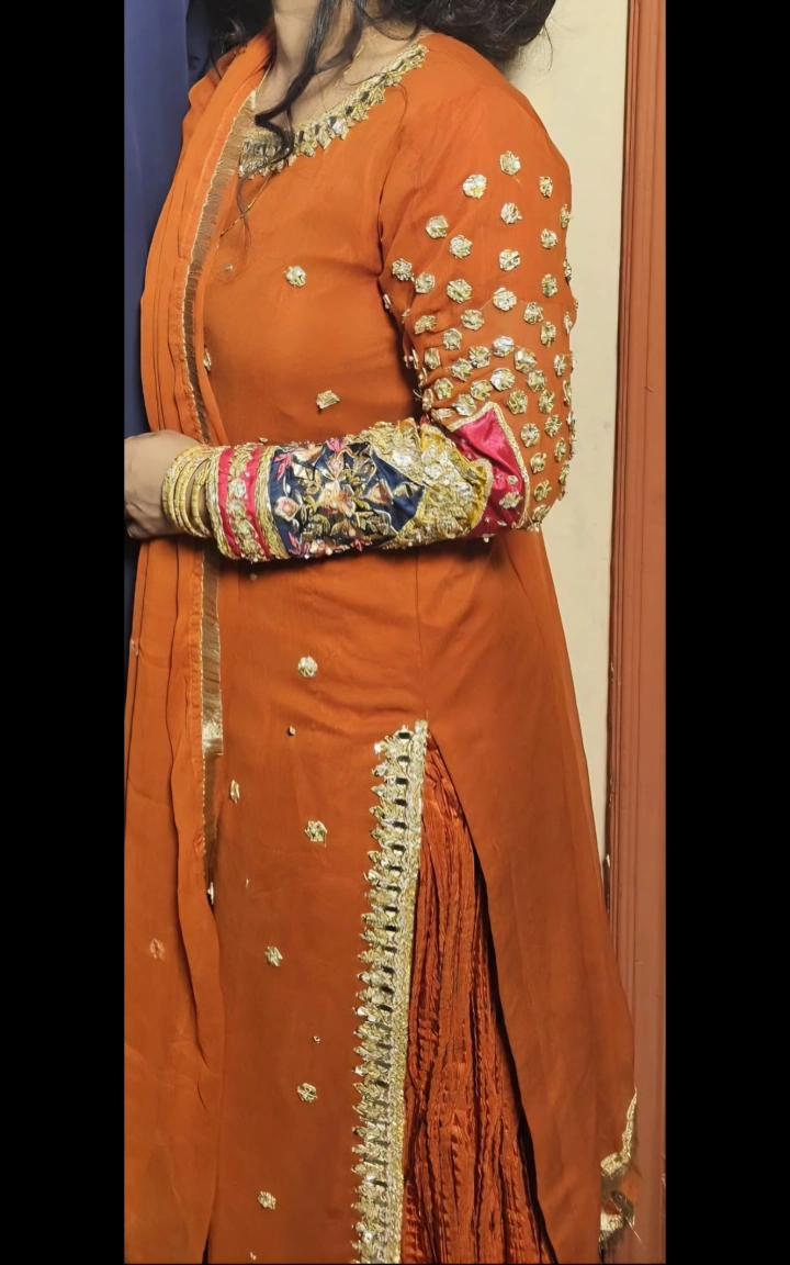 Beautiful orange salwar kameez with intricate embroidery. Perfect for special occasions! Only worn once with debatable. Grara Pants.