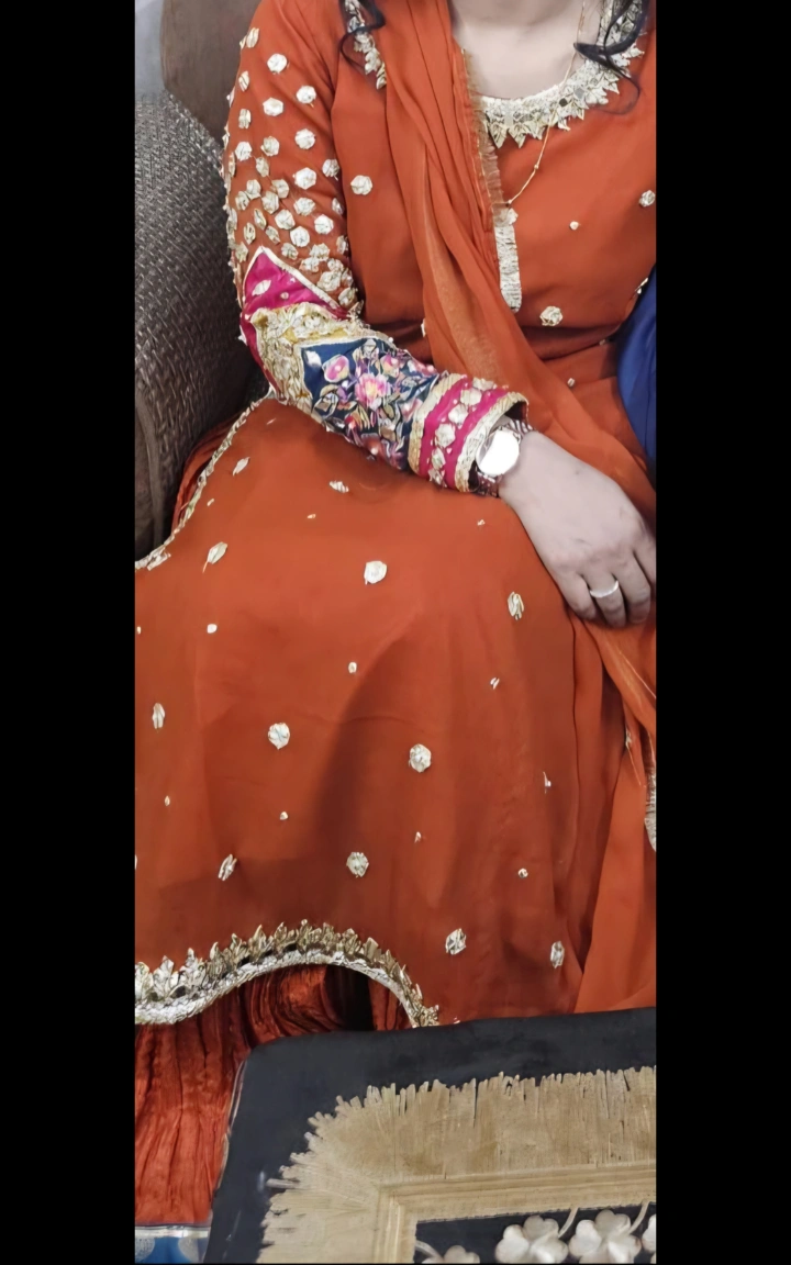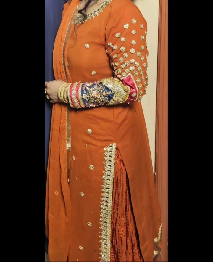 Beautiful orange salwar kameez with intricate embroidery. Perfect for special occasions! Only worn once with debatable. Grara Pants.