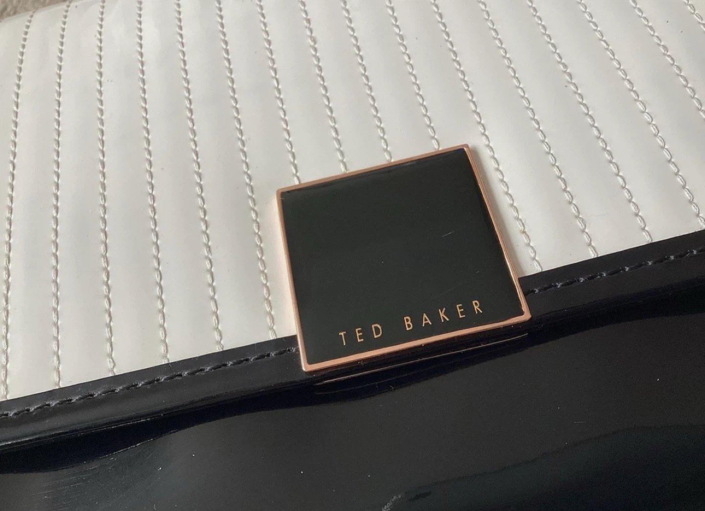 Selling a cute Ted Baker London crossbody bag in black and cream. It's a stylish accessory that's perfect for everyday use. The interior has a floral pattern. There are some signs of use, but overall it's in good condition!
