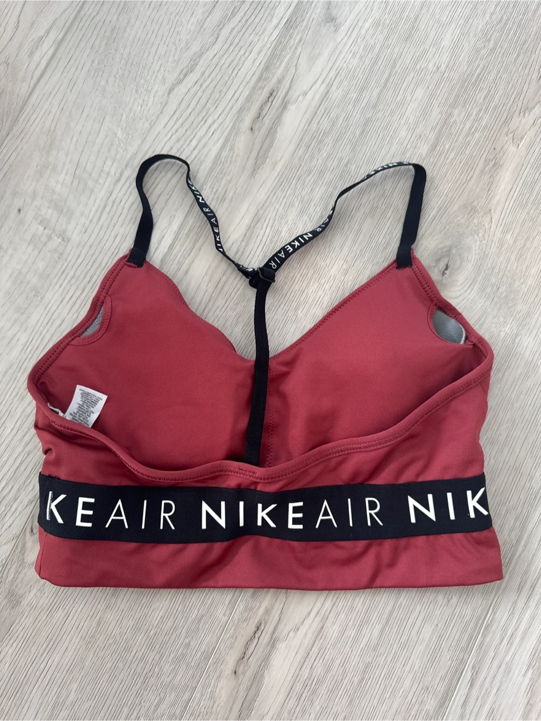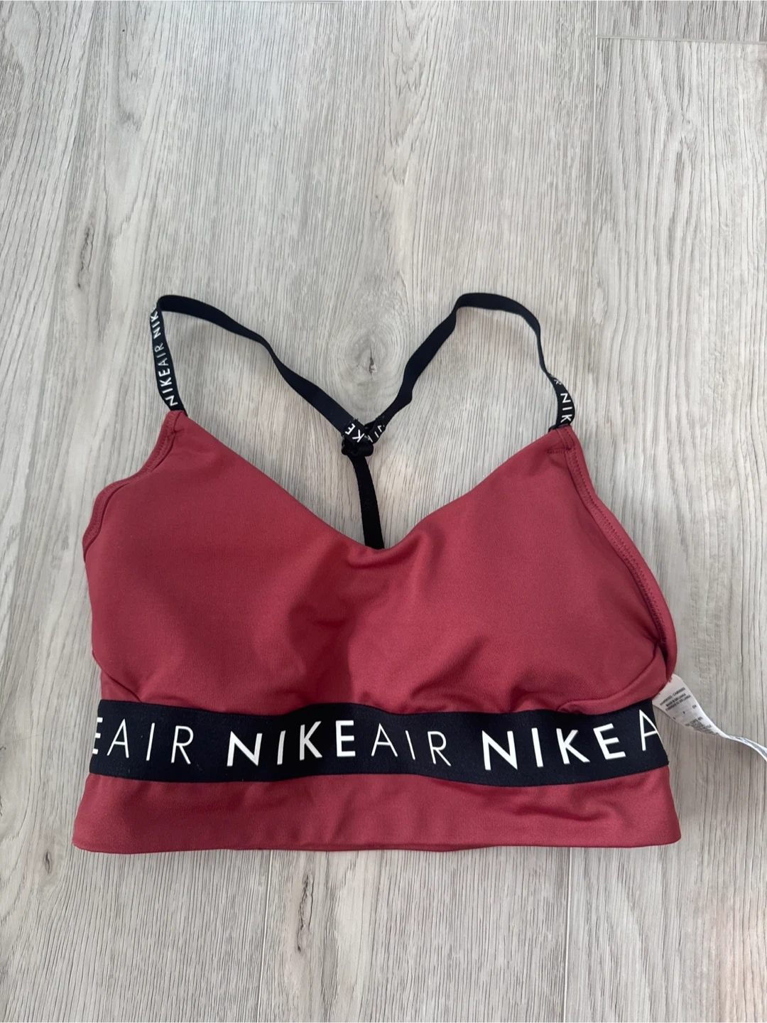 Selling a Nike Air Dri-FIT sports bra in size small! It's a lovely burgundy colour with black straps and the Nike Air logo around the band. Perfect for workouts or everyday wear!