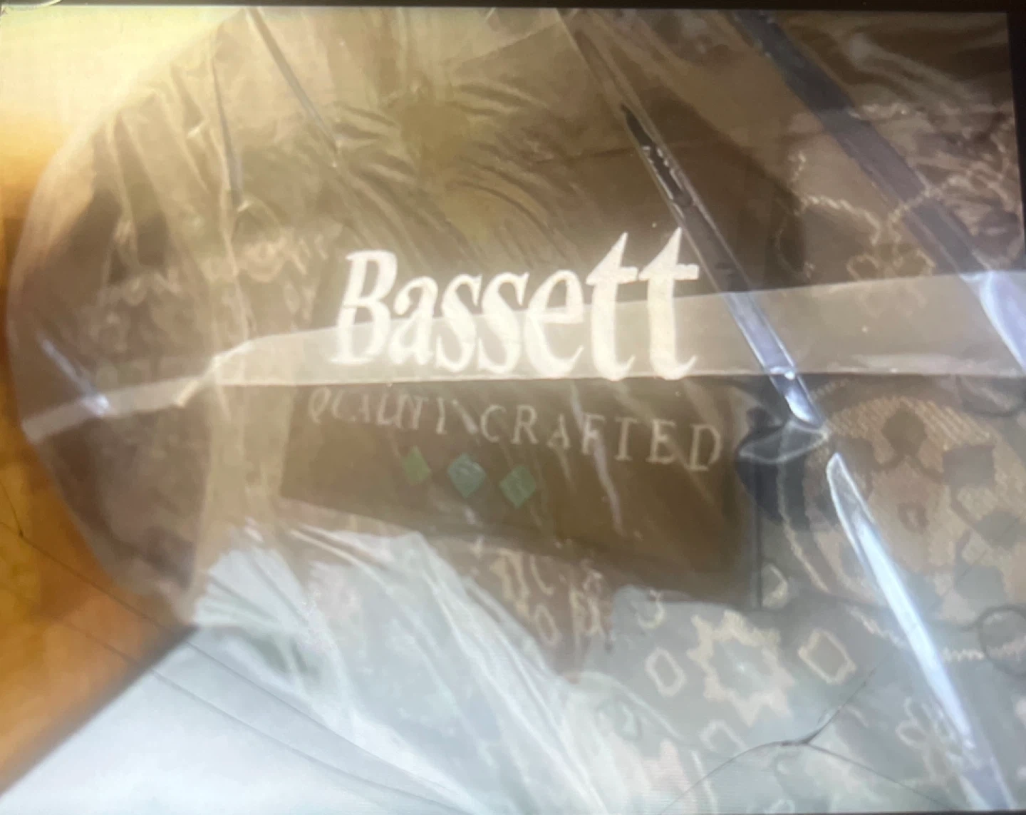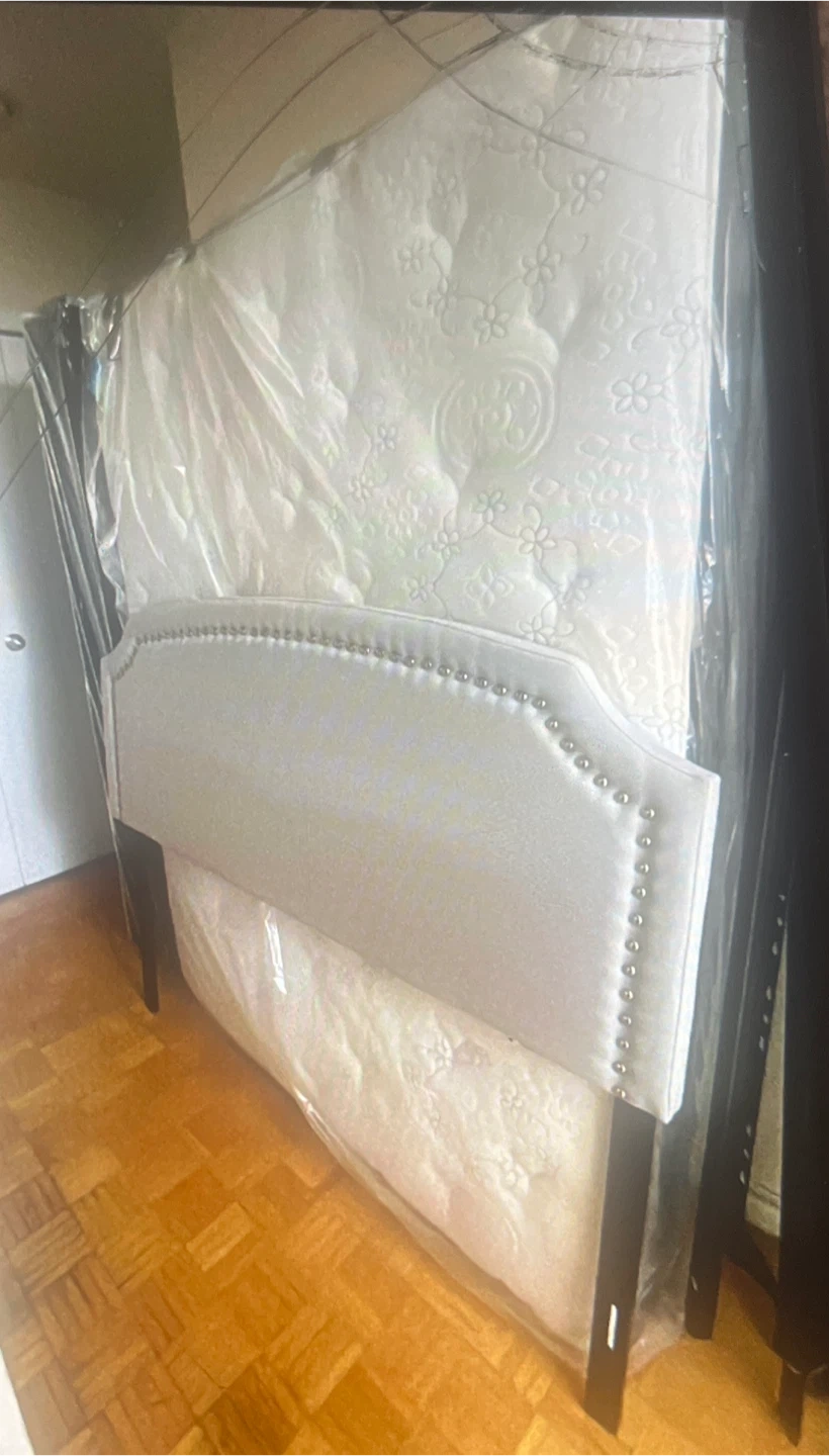 Very neat a double double size mattress, spring box, bed frames and headboard. It’s called Bessett so very good quality and headboard is light grey with nailhead trim. The mattress appears to be in good condition and is still wrapped in plastic. Perfect for a bedroom upgrade! So used this about four months