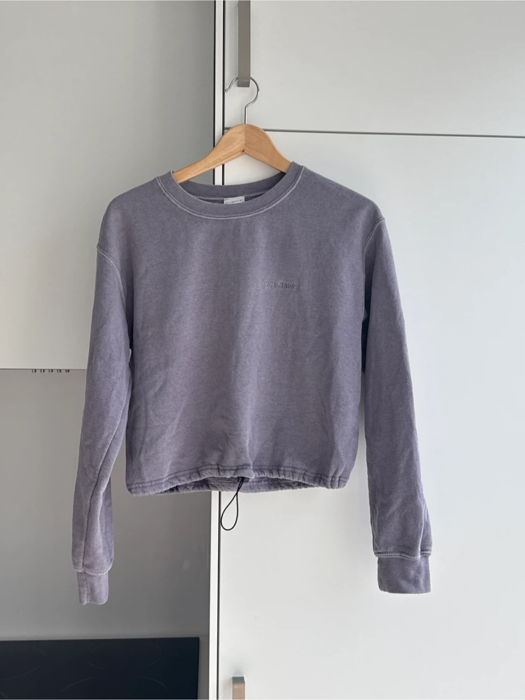 Selling a cute Iets Frans cropped sweatshirt in size small! It's in great condition and has a drawstring at the bottom. The colour is a lovely faded purple. Perfect for layering or wearing on its own!