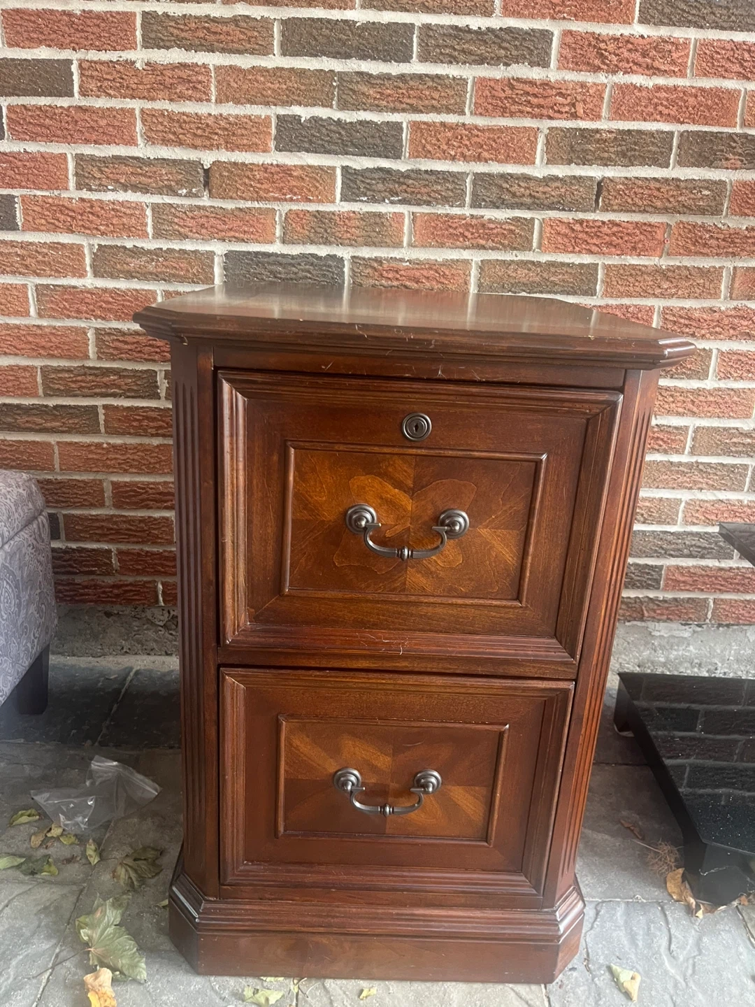 Here's a lovely Whalen wood filing cabinet. It features two drawers, perfect for organizing your documents and keeping your space tidy. The cabinet has a classic design and a rich wood finish that will complement any home or office decor. It's in great condition and ready to use!