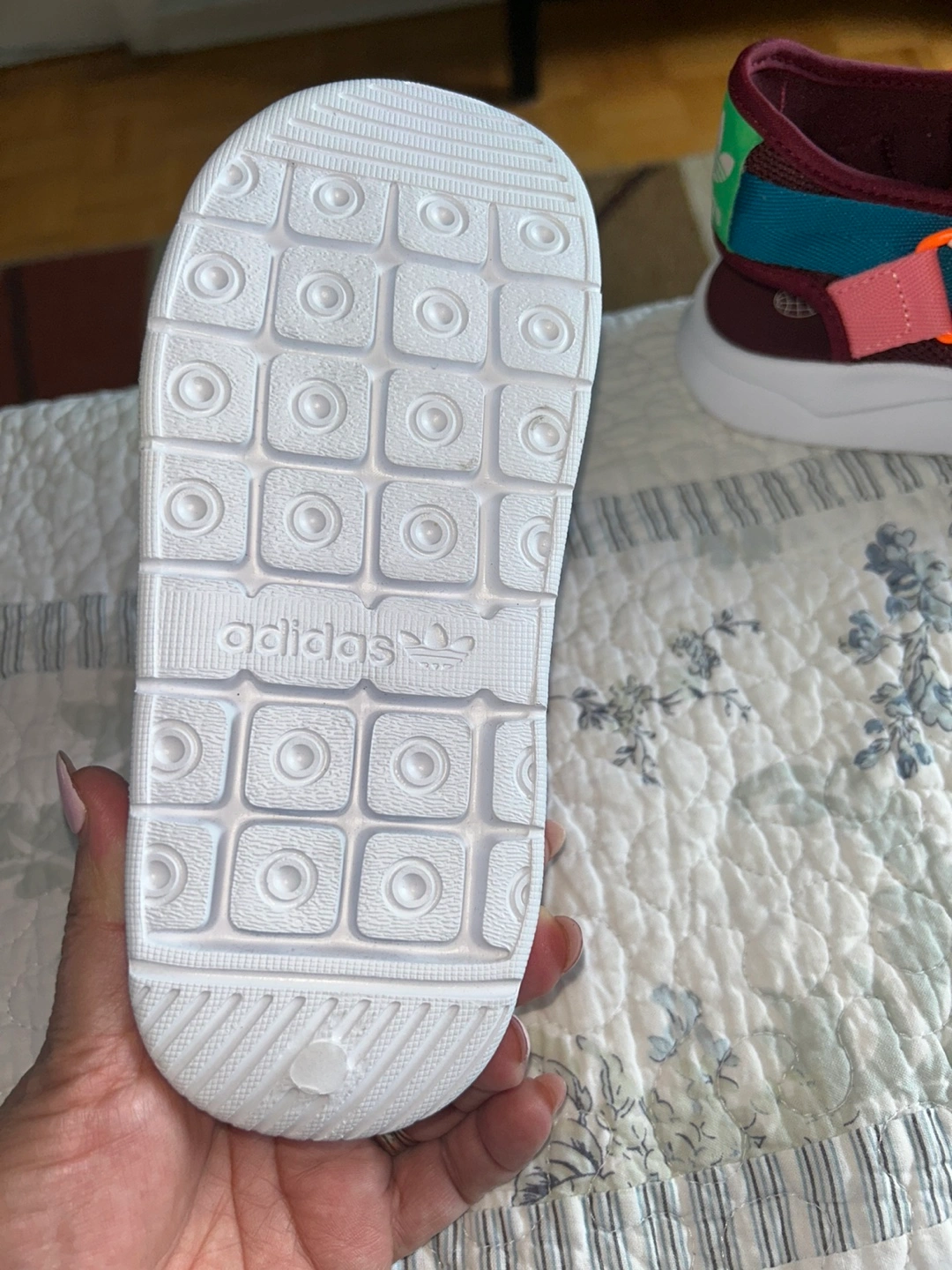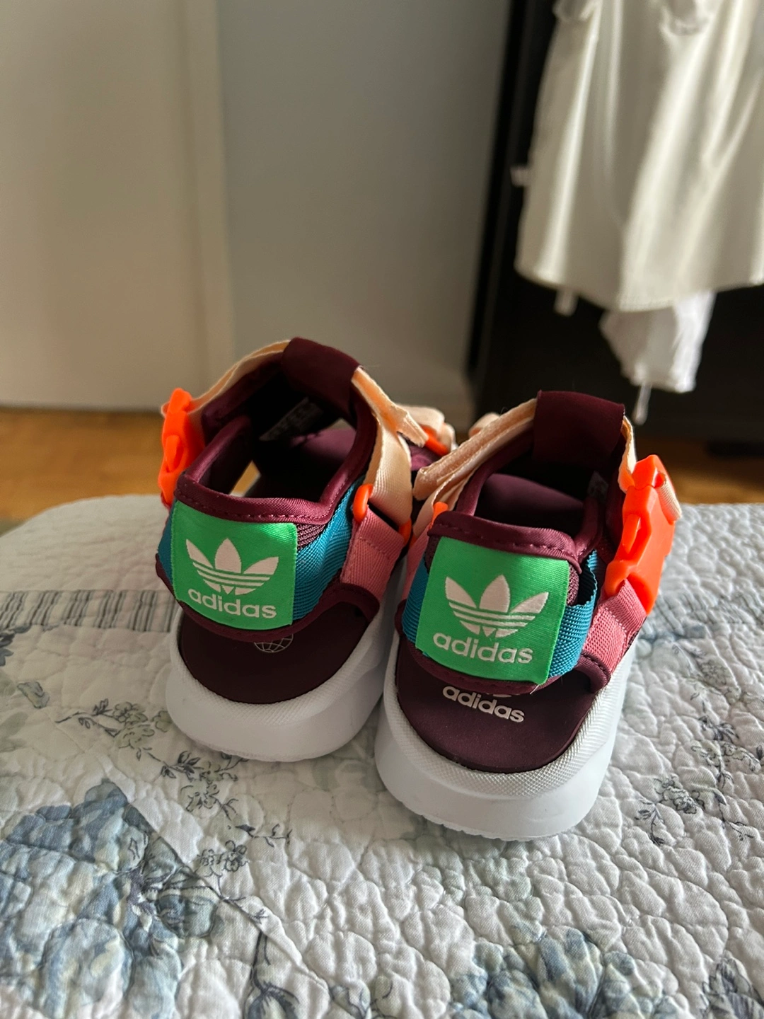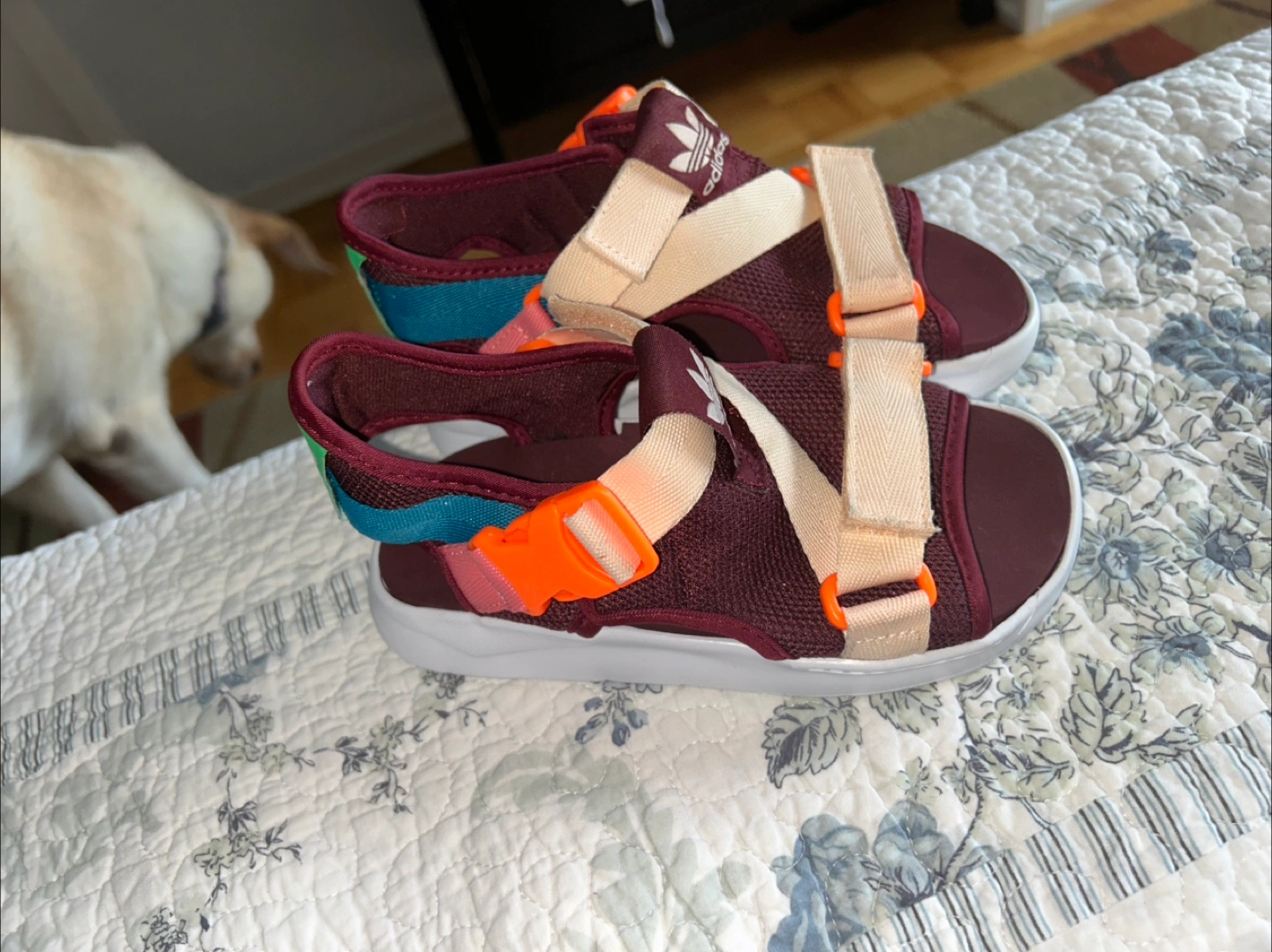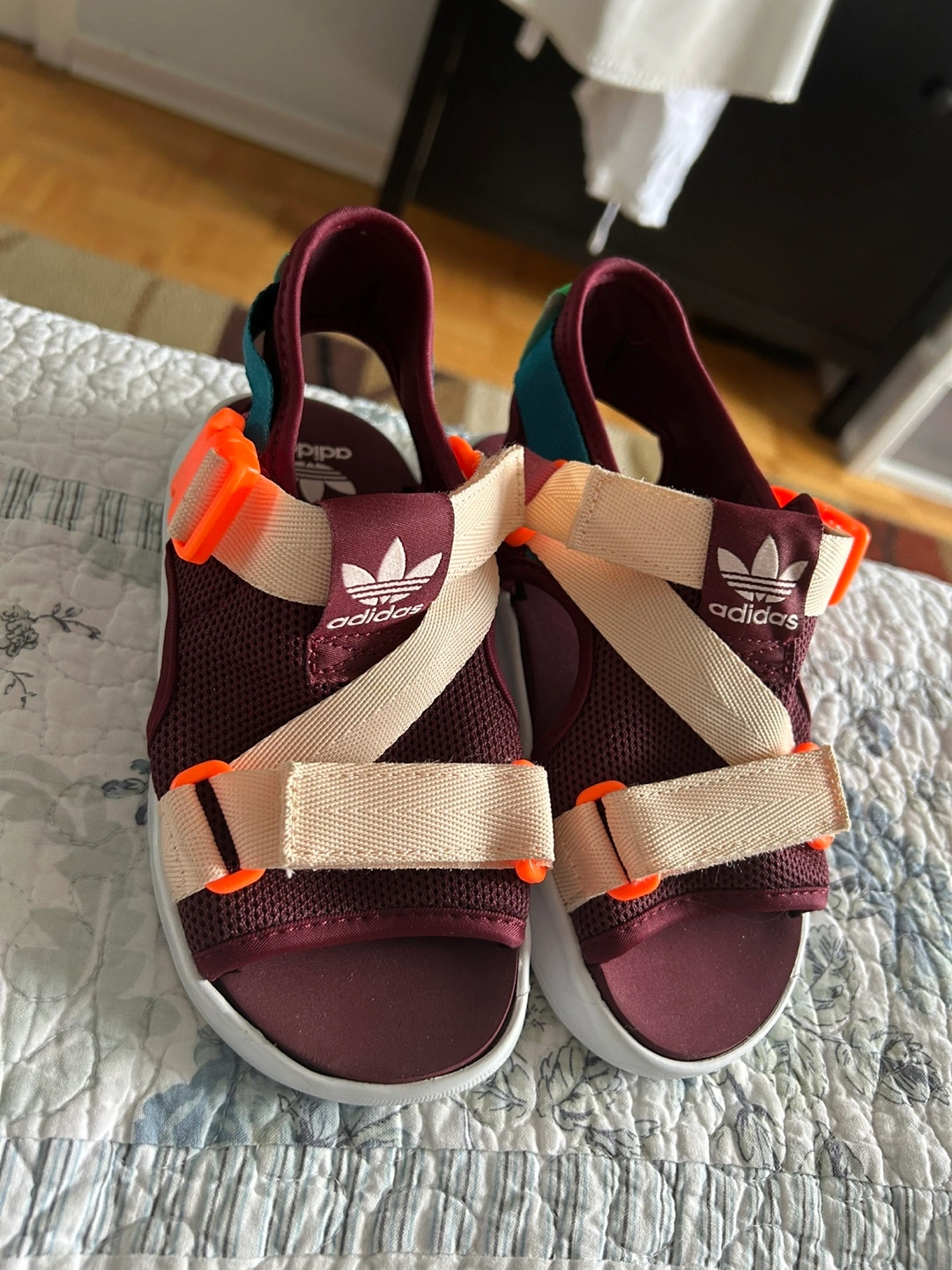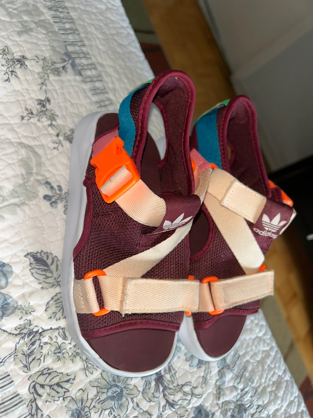 These Adidas Adilette sandals are in great condition and ready for a new home! They feature a unique burgundy colourway with adjustable straps and a comfortable footbed. Perfect for summer days or casual outings!
