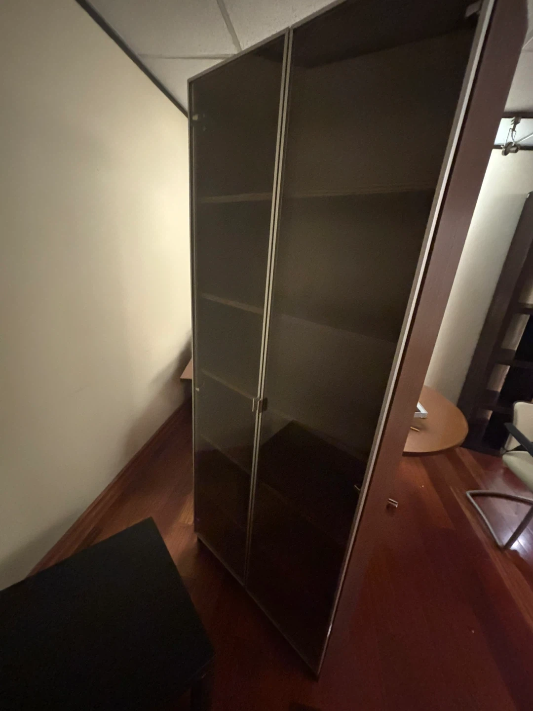 Selling a tall bookshelf with glass doors. It's in great condition and has plenty of space for books or other items. Perfect for adding some extra storage to your home or office