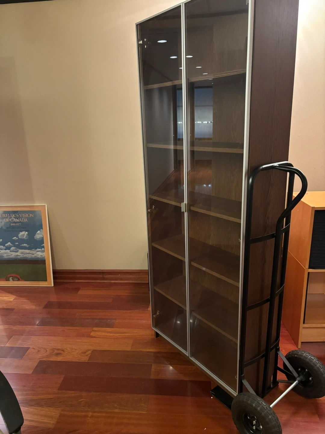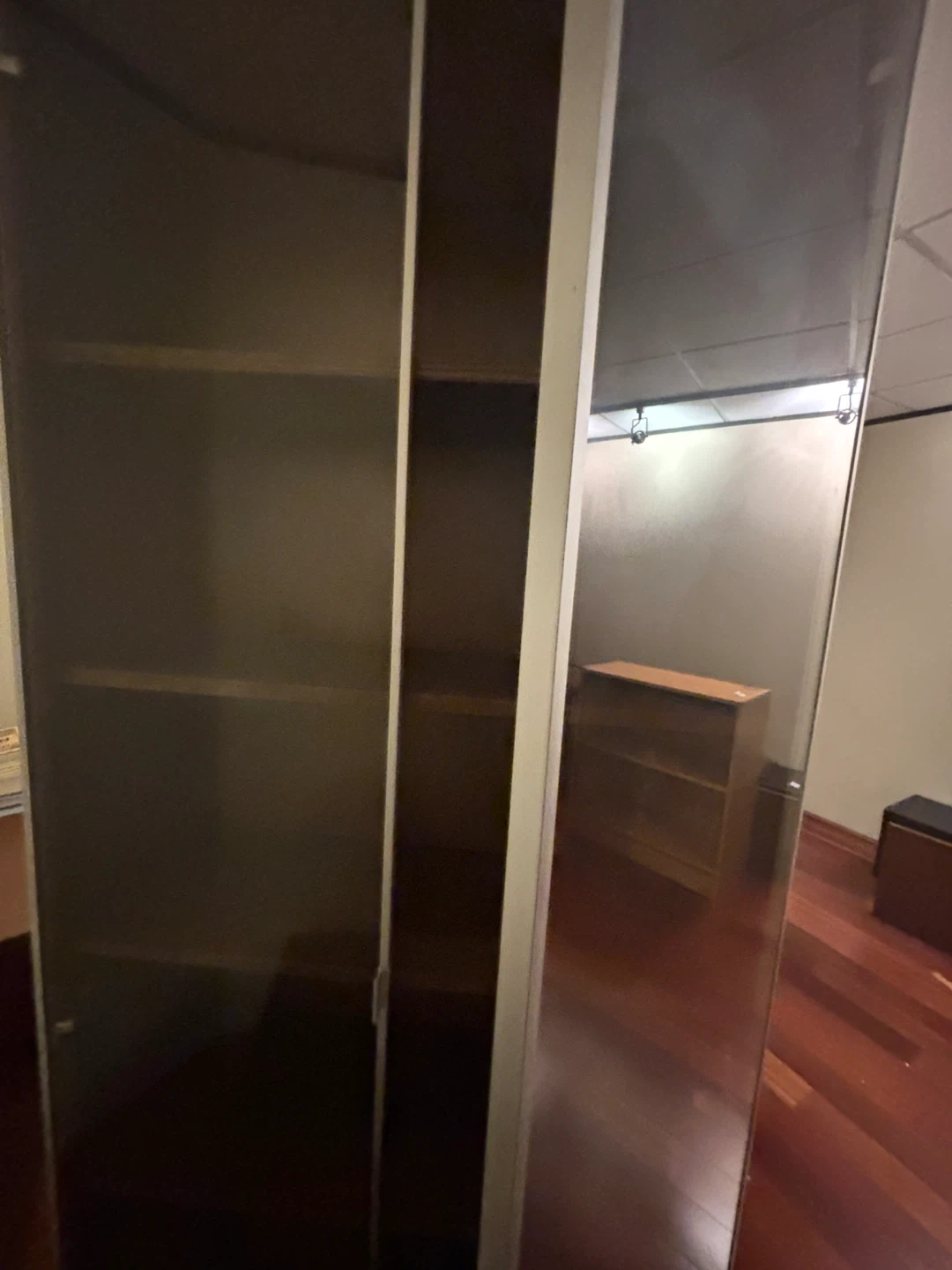 Selling a tall bookshelf with glass doors. It's in great condition and has plenty of space for books or other items. Perfect for adding some extra storage to your home or office