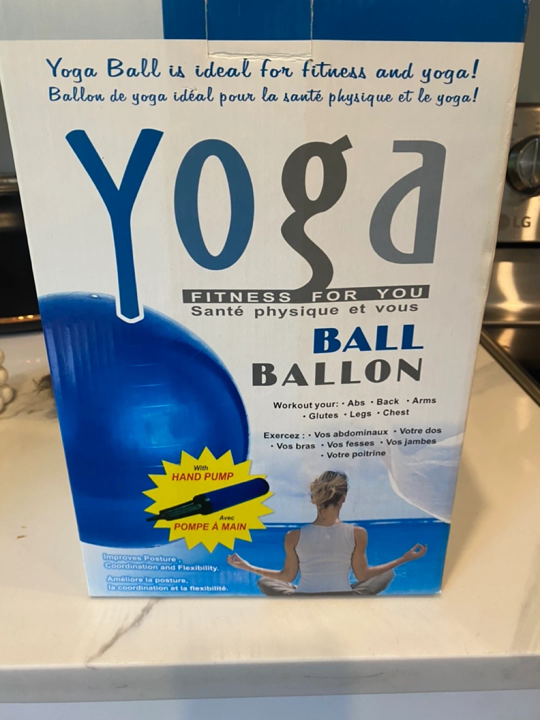 Get fit with this Yoga Fitness Ball! It's ideal for fitness and yoga. The box says it helps you workout your abs, back, arms, glutes, legs, and chest. It also comes with a hand pump to inflate the ball easily. New in box.