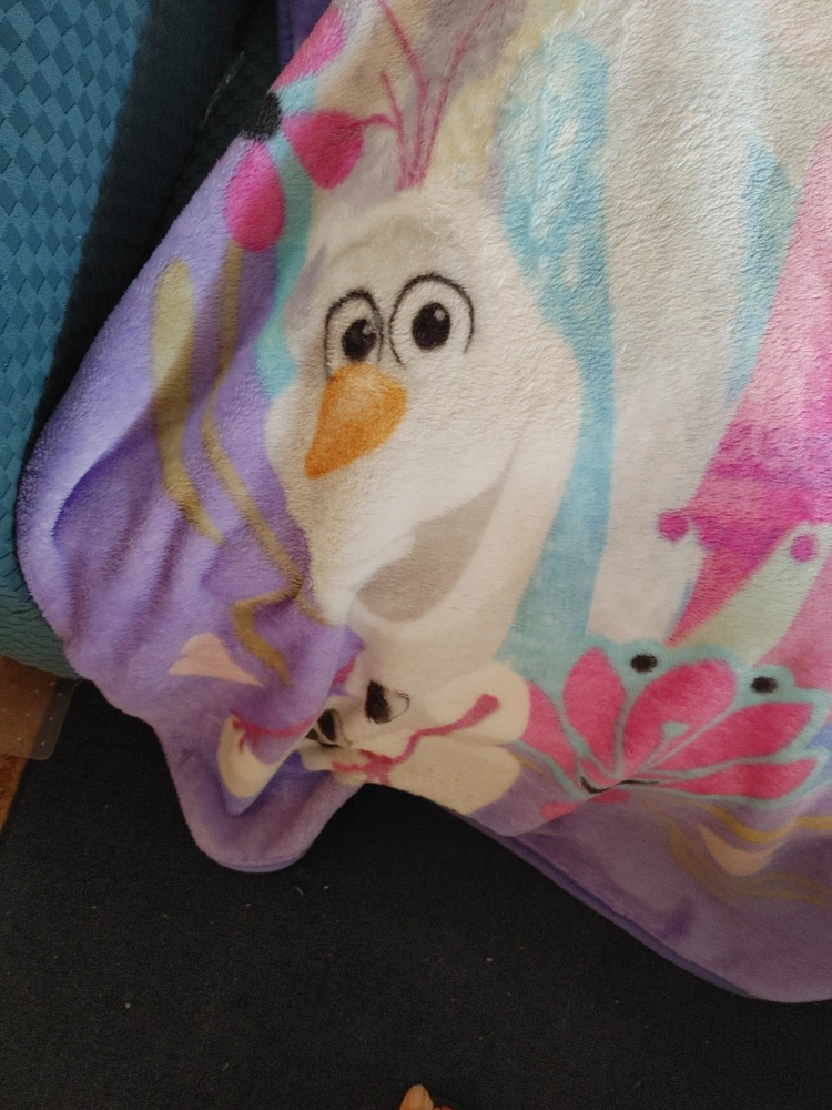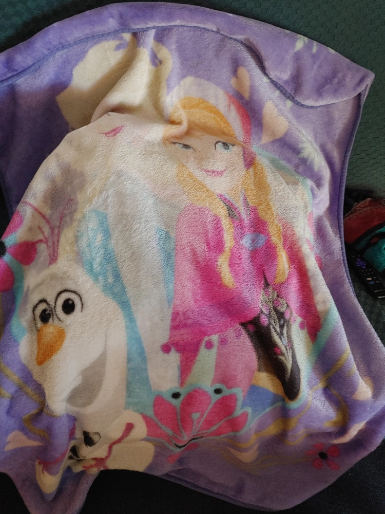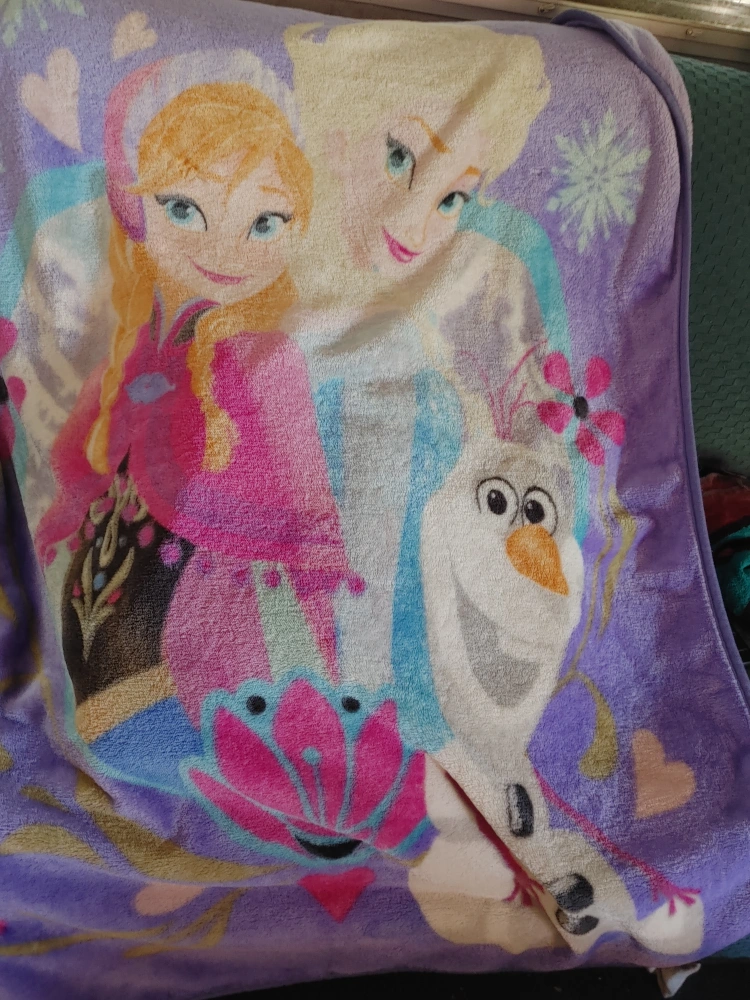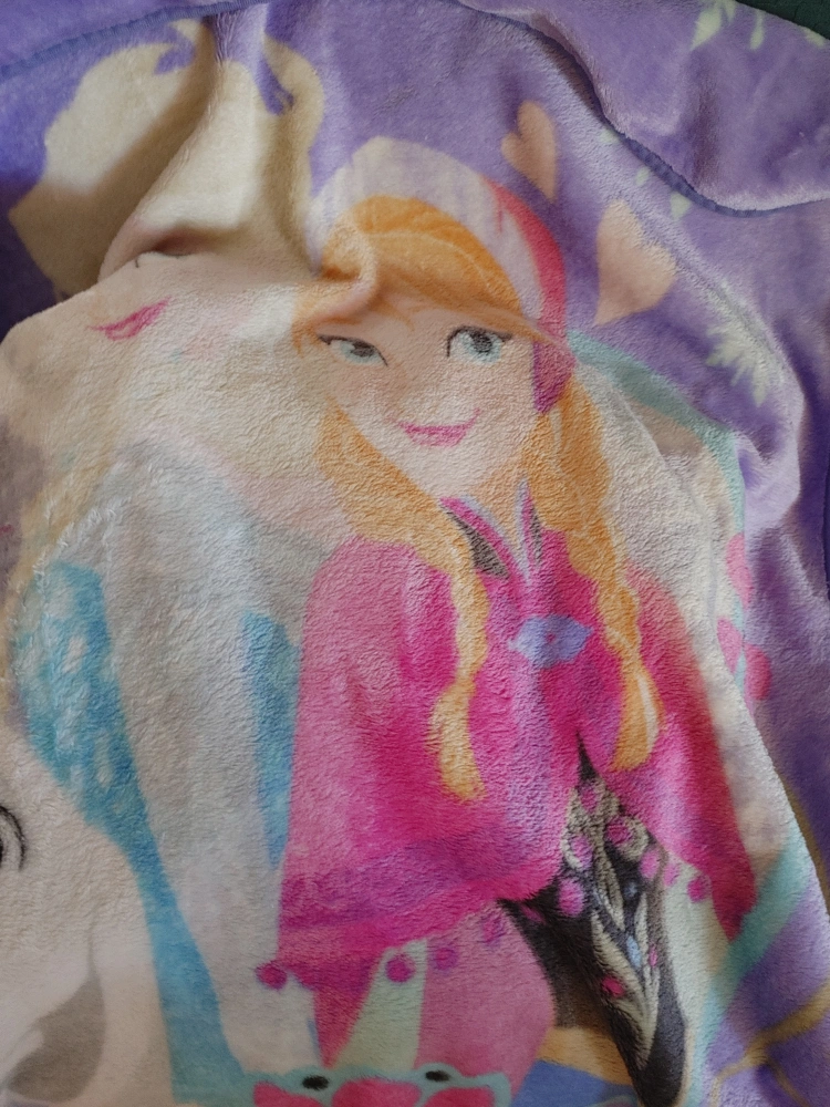 Selling a cozy Disney Frozen throw blanket! It features Anna, Elsa, and Olaf on a lovely purple background. Perfect for any Frozen fan to snuggle up with!