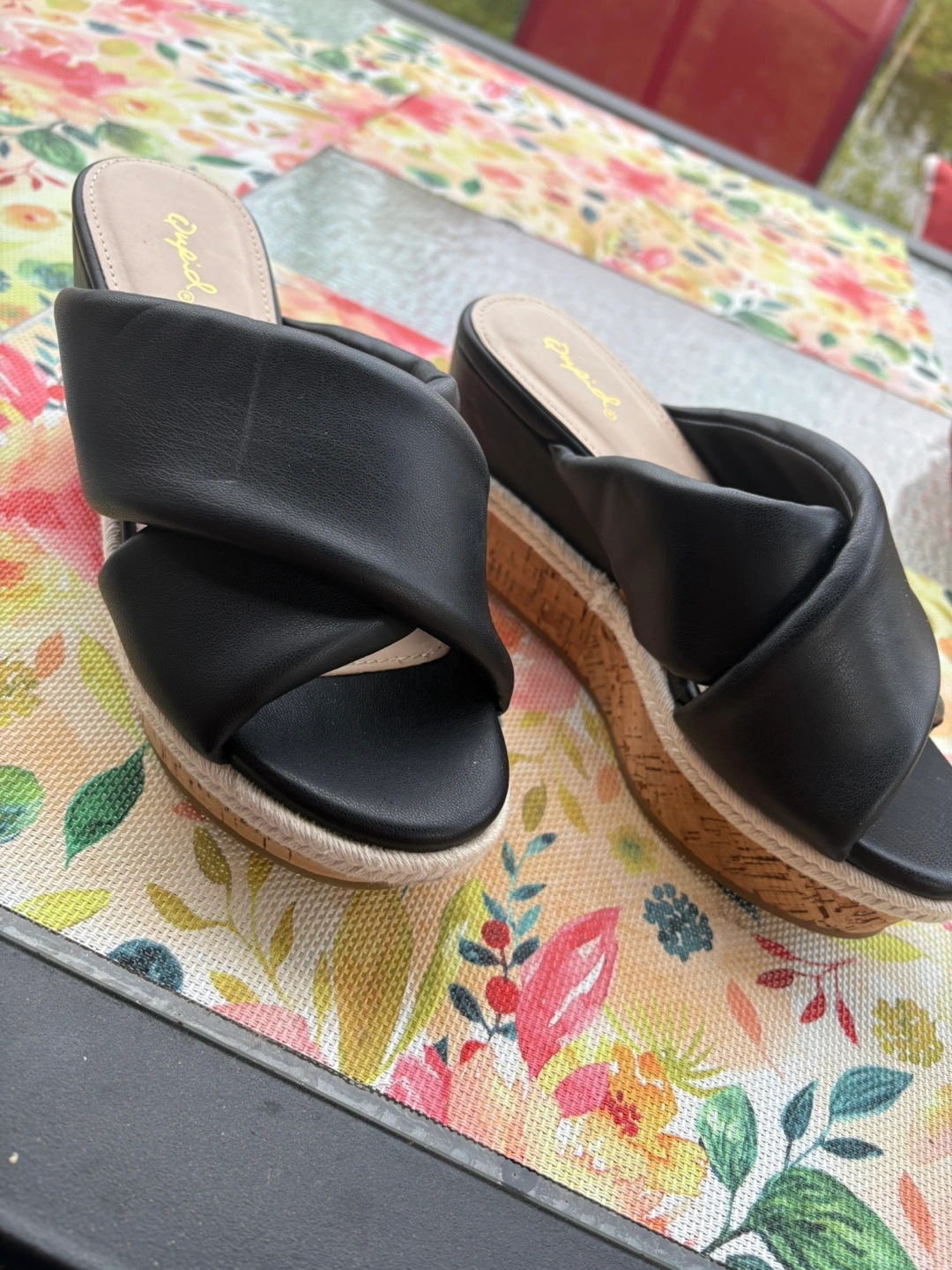 Cute black wedge sandals from Qupid! These are a size 5.5 feature a stylish criss-cross design. The wedge heel has a cork detail, making them perfect for adding a bit of flair to your outfit. Like new!