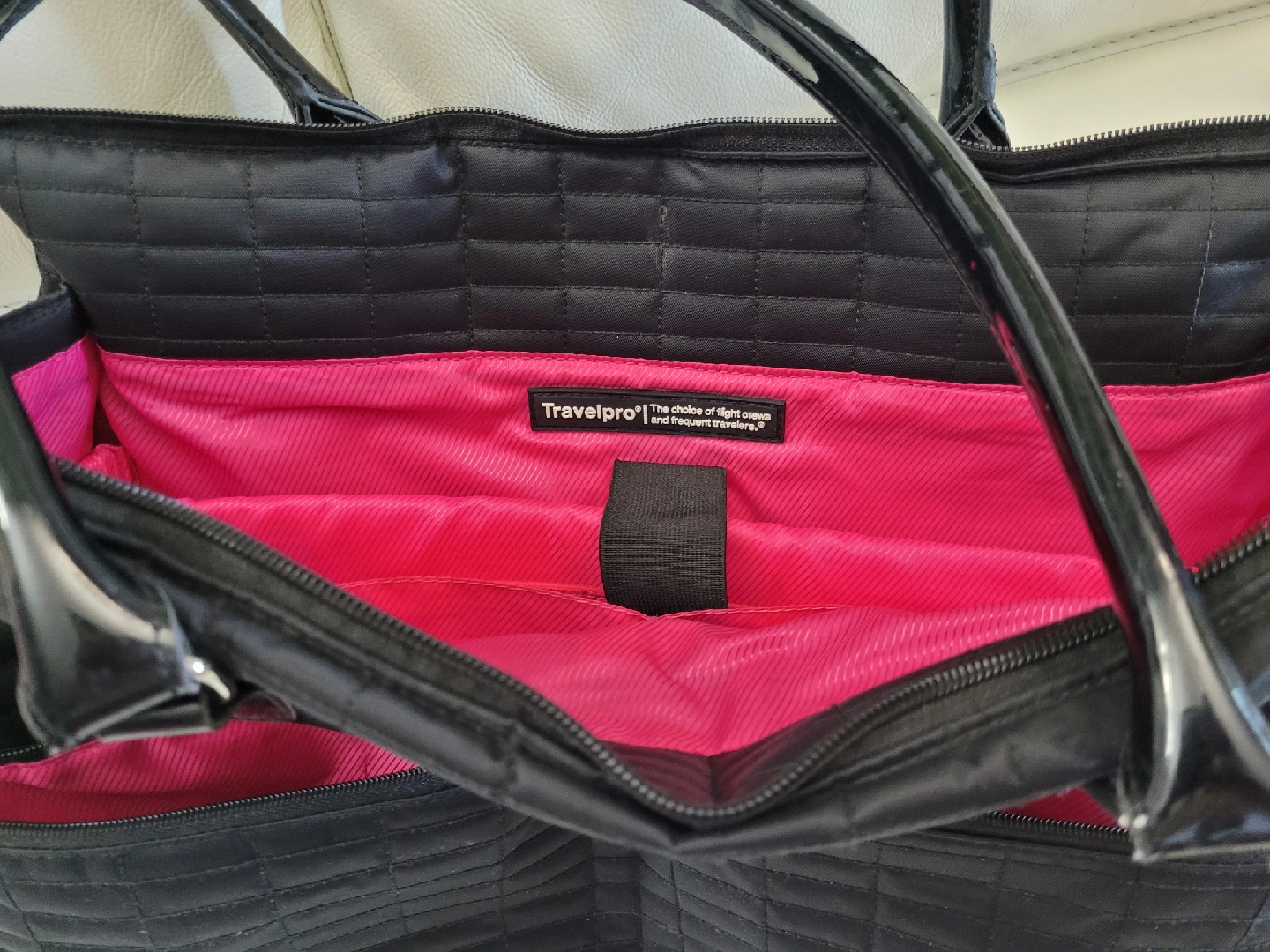 This is a Travelpro tote bag in black with a quilted pattern. It features a bright pink interior lining. The bag is in good condition and perfect for travel or everyday use!