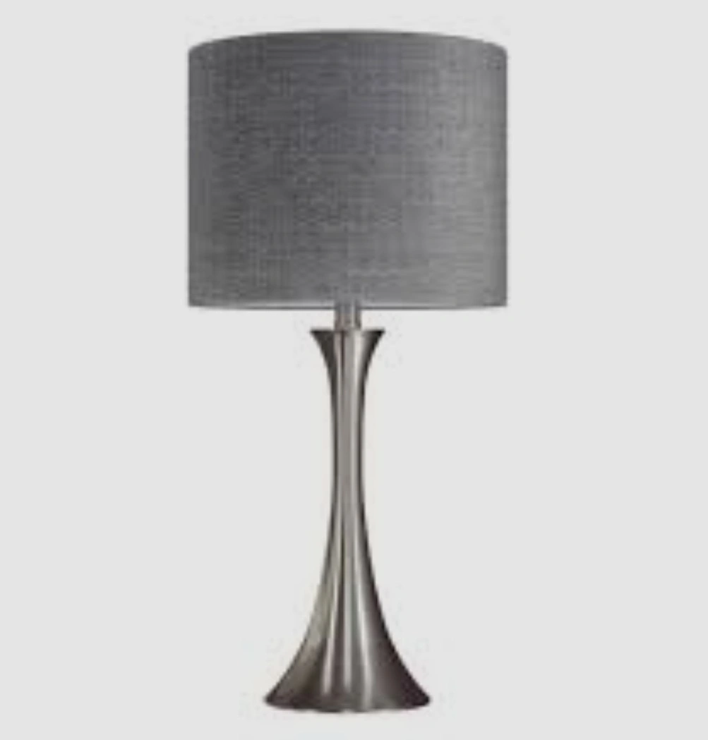 Selling a table lamp with a sleek brushed nickel base and a stylish grey shade.