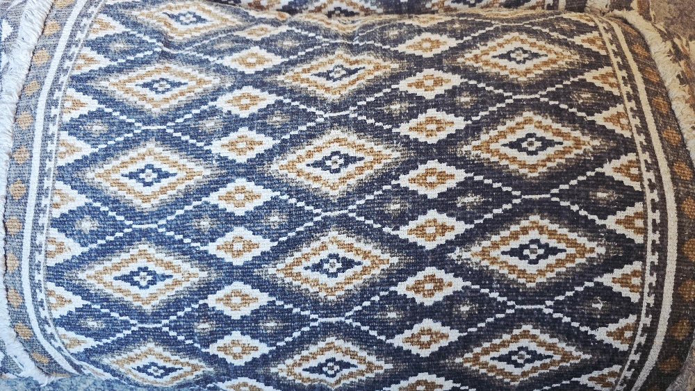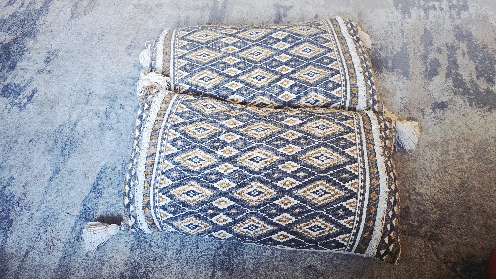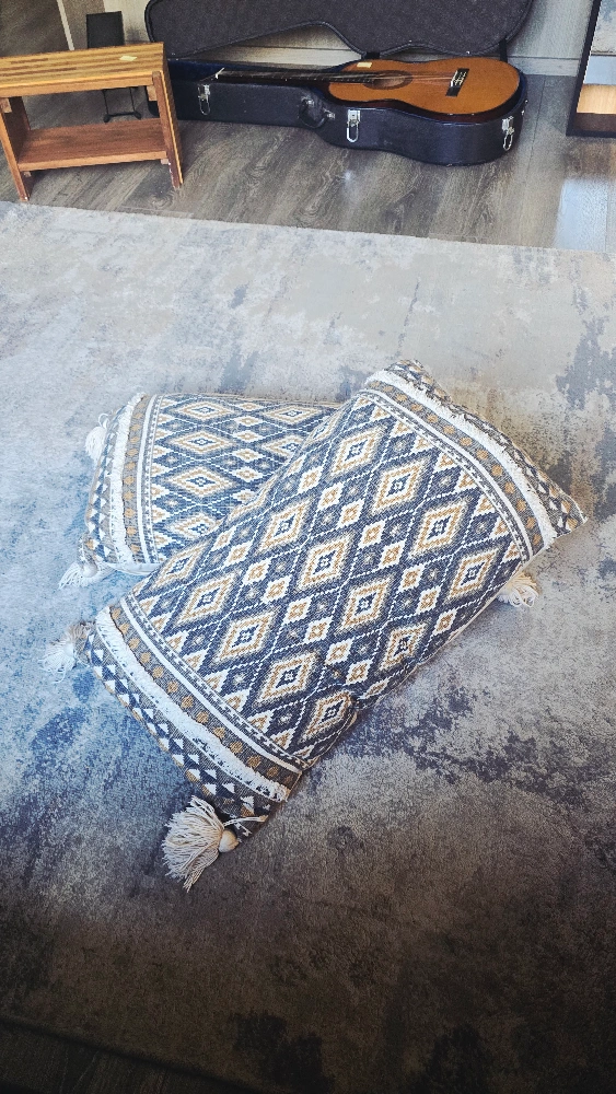 Selling a set of two decorative throw pillows! They feature a unique woven pattern in shades of blue, brown, and cream, complete with tassel details. These pillows are in great condition and would add a cozy touch to any living space or bedroom
