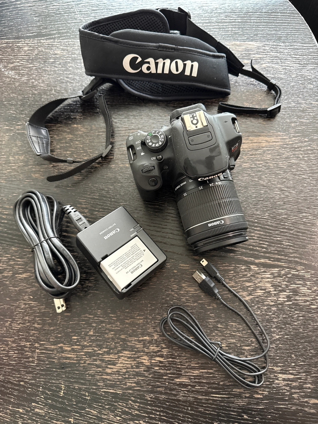 51Looking to sell my Canon EOS Rebel T5i DSLR camera! It comes with an 18-55mm lens, perfect for getting started with photography. Also included are the battery charger, USB cable, and Canon neck strap. It is missing the lens cap. Great for anyone wanting to upgrade their photography game!