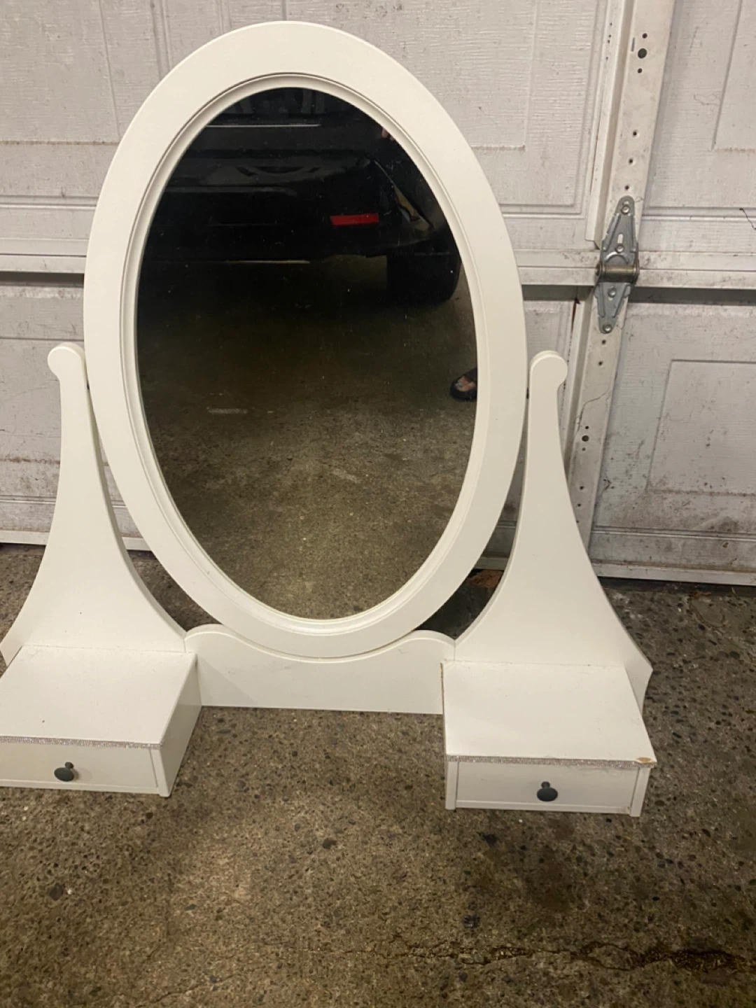 10Selling a lovely white oval vanity mirror. It's in great shape and would look perfect in any bedroom or dressing area. It has two small drawers on the bottom for storing makeup or jewelry. A stylish and functional addition to your space!