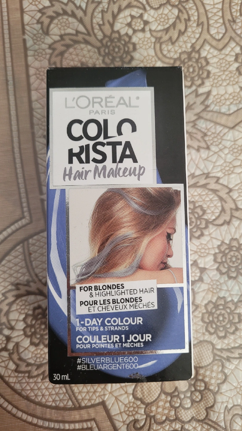 Selling a brand new box of L'Oréal Colorista Hair Makeup in Silver Blue! It's a 1-day colour for tips and strands, perfect for blondes and highlighted hair. This hair makeup is a gentle leave-in formula that washes out with shampoo, making it easy to experiment with different looks. It's a fun and easy way to add a pop of colour to your hair!