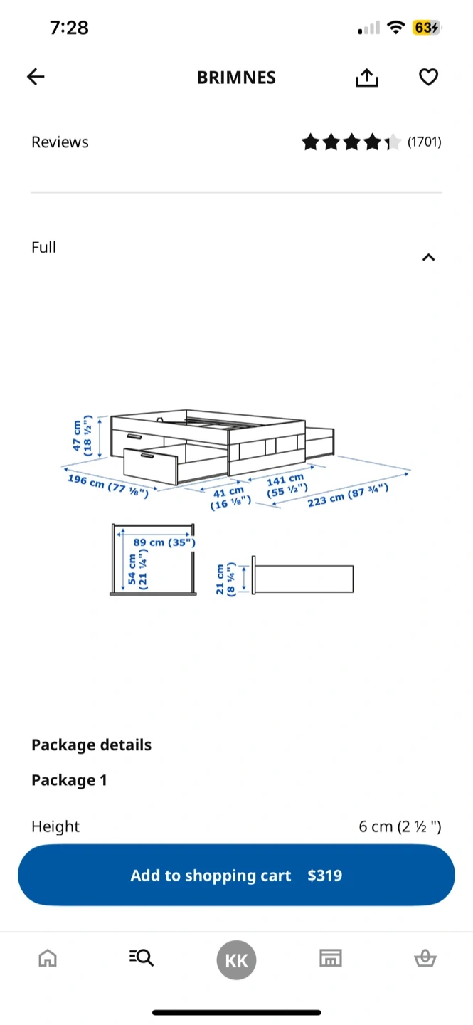 Ikea BRIMNES Bed Frame with Storage, White, Full/Double