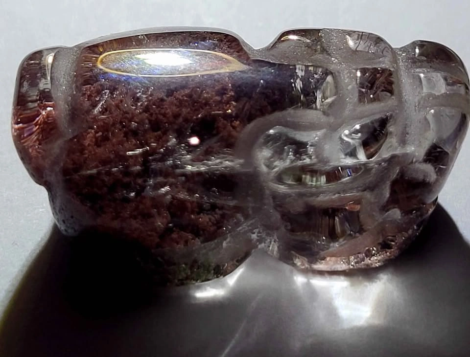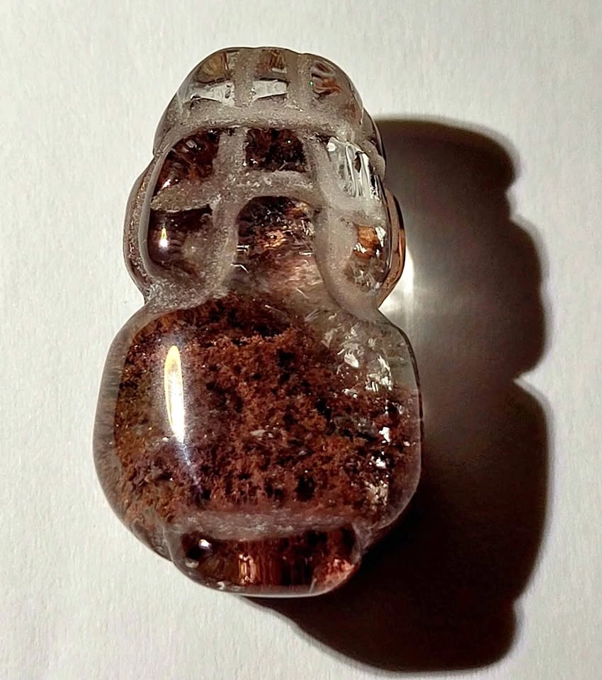 Gorgeous Lodolite Crystal Pixiu with dark red mineral inclusions. This one is carved by hand (not mass produced) to get the best quality in the Quartz to show. This one is 26x15x10mm.