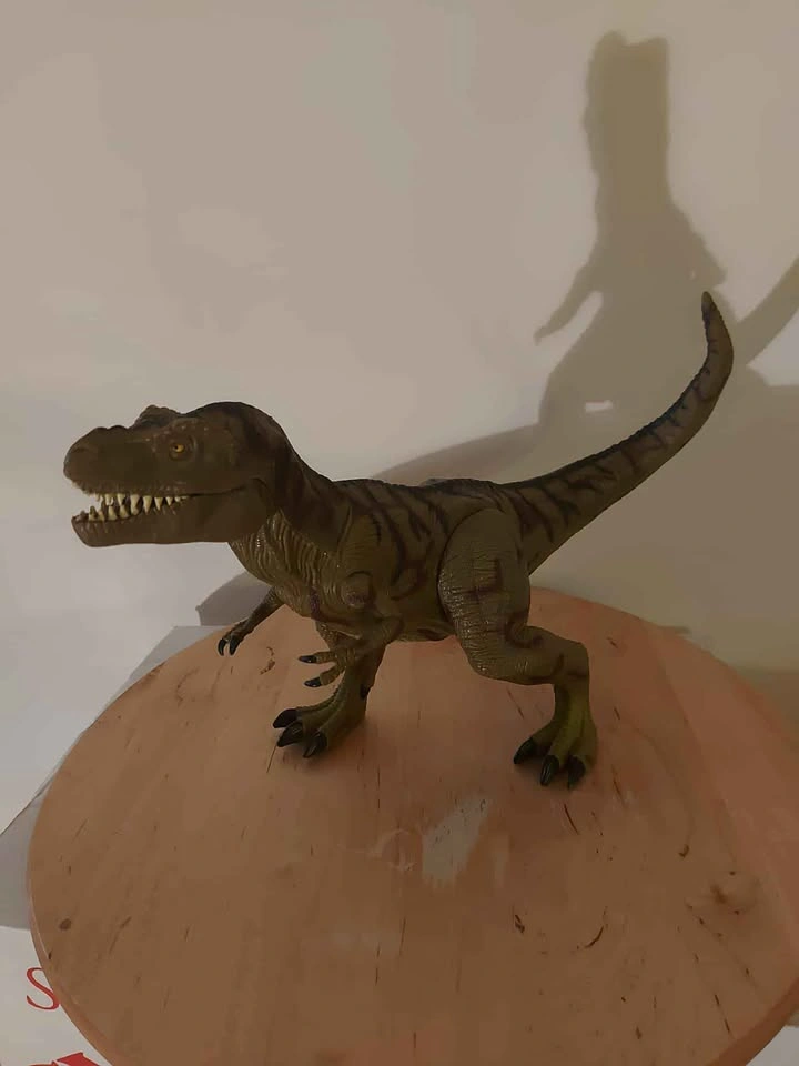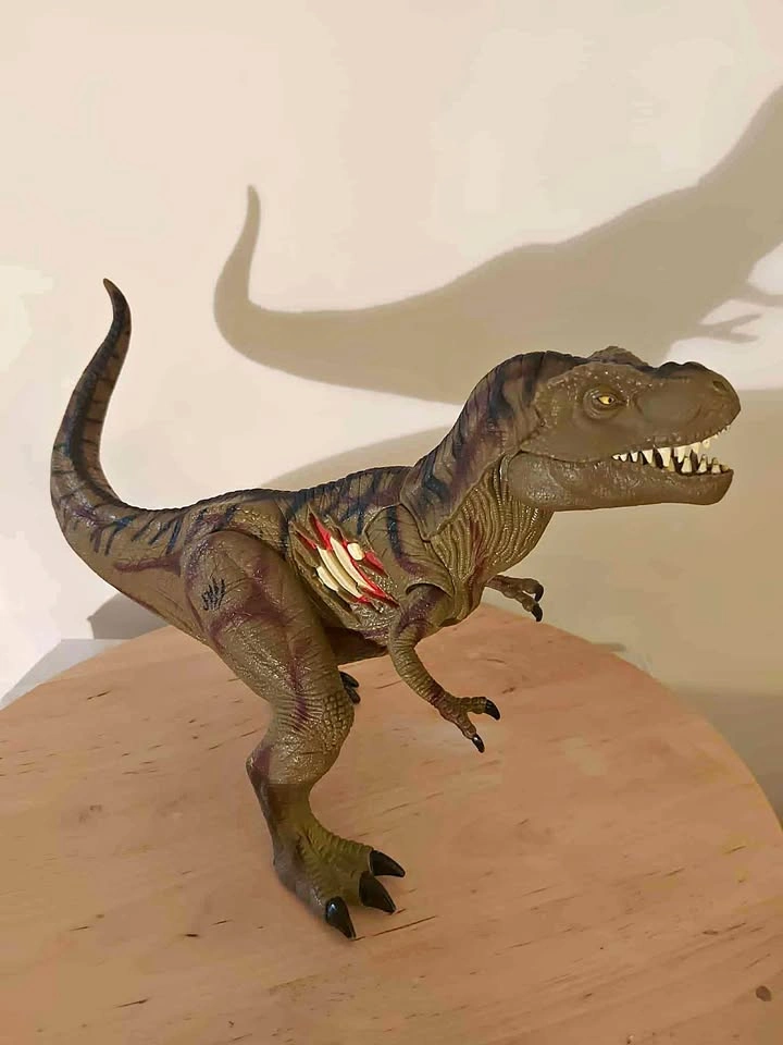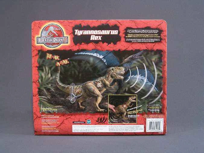 10This Tyrannosaurus Rex figure measures approximately 25 centimetres in length and stands just over 15 centimetres tall. A black JP III logo is located on its right leg. A large wound can be found on its right flank, showing ribs and muscle tissue. The upper piece of exposed rib is actually a button which activates a shrieking roar. A second roar can be made by pulling down on its right arm, when doing so the mouth will also open. A third sound can be made by having the T-Rex stomp on the ground. The box is not included nor are batteries. Takes 3 LR44 to produce sounds.