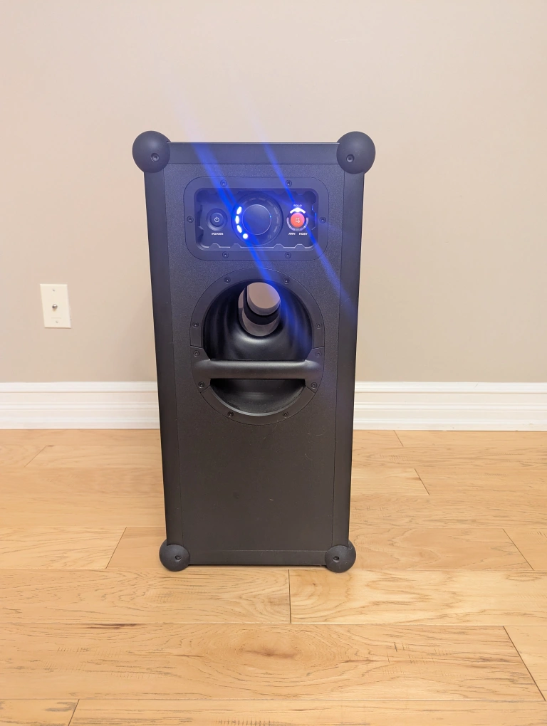feturing two 10-inch woofers, a 1-inch compression driver tweeter, and three 72-watt RMS Class-D amplifiers for a maximum SPL of 126 dB. It offers Bluetooth 5.0, a swappable 40-hour capacity battery (at mid-volume), a two-hour full recharge time, and connectivity for up to five SKAA-enabled speakers via TeamUP. The speaker includes professional XLR/TRS inputs and a stereo output, a 40 Hz - 20 kHz frequency range, and an IP65-rated electronic coating for durability