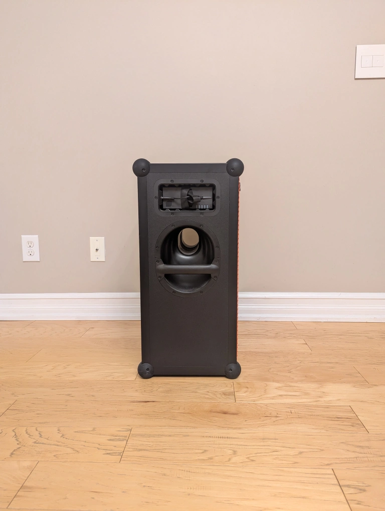 feturing two 10-inch woofers, a 1-inch compression driver tweeter, and three 72-watt RMS Class-D amplifiers for a maximum SPL of 126 dB. It offers Bluetooth 5.0, a swappable 40-hour capacity battery (at mid-volume), a two-hour full recharge time, and connectivity for up to five SKAA-enabled speakers via TeamUP. The speaker includes professional XLR/TRS inputs and a stereo output, a 40 Hz - 20 kHz frequency range, and an IP65-rated electronic coating for durability