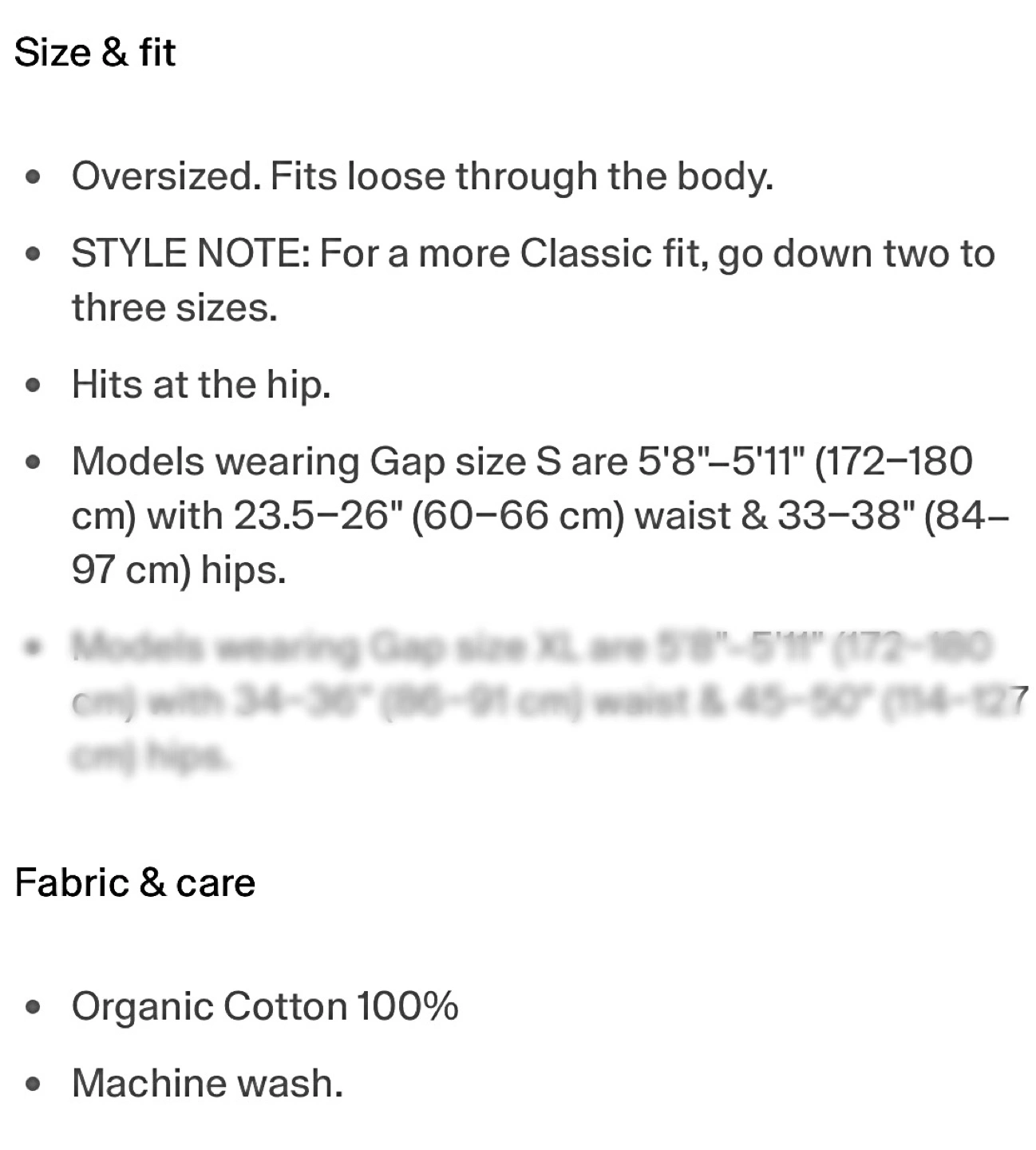 • Size Small – oversized fit, can comfortably fit Medium or even Large depending on desired look