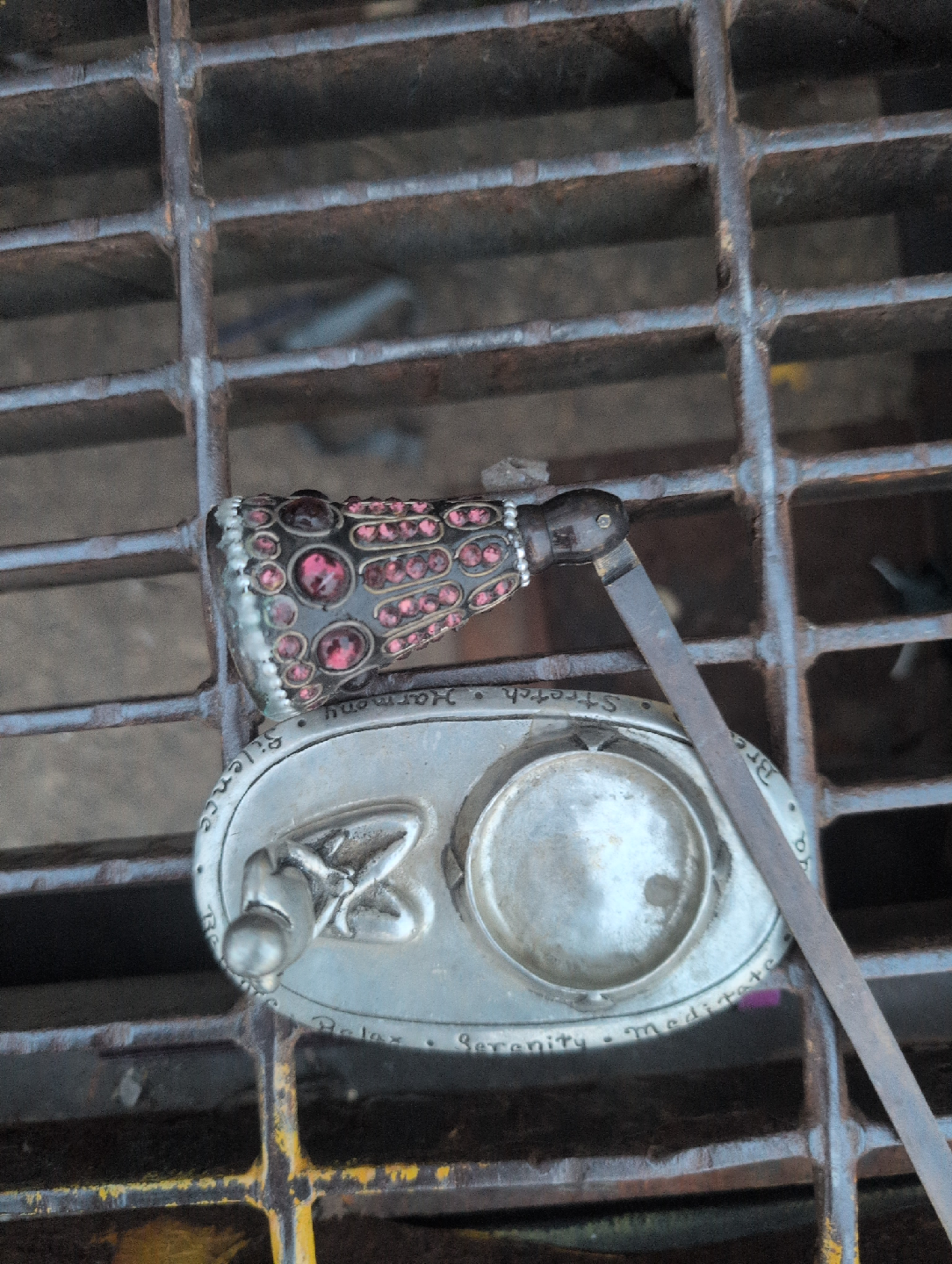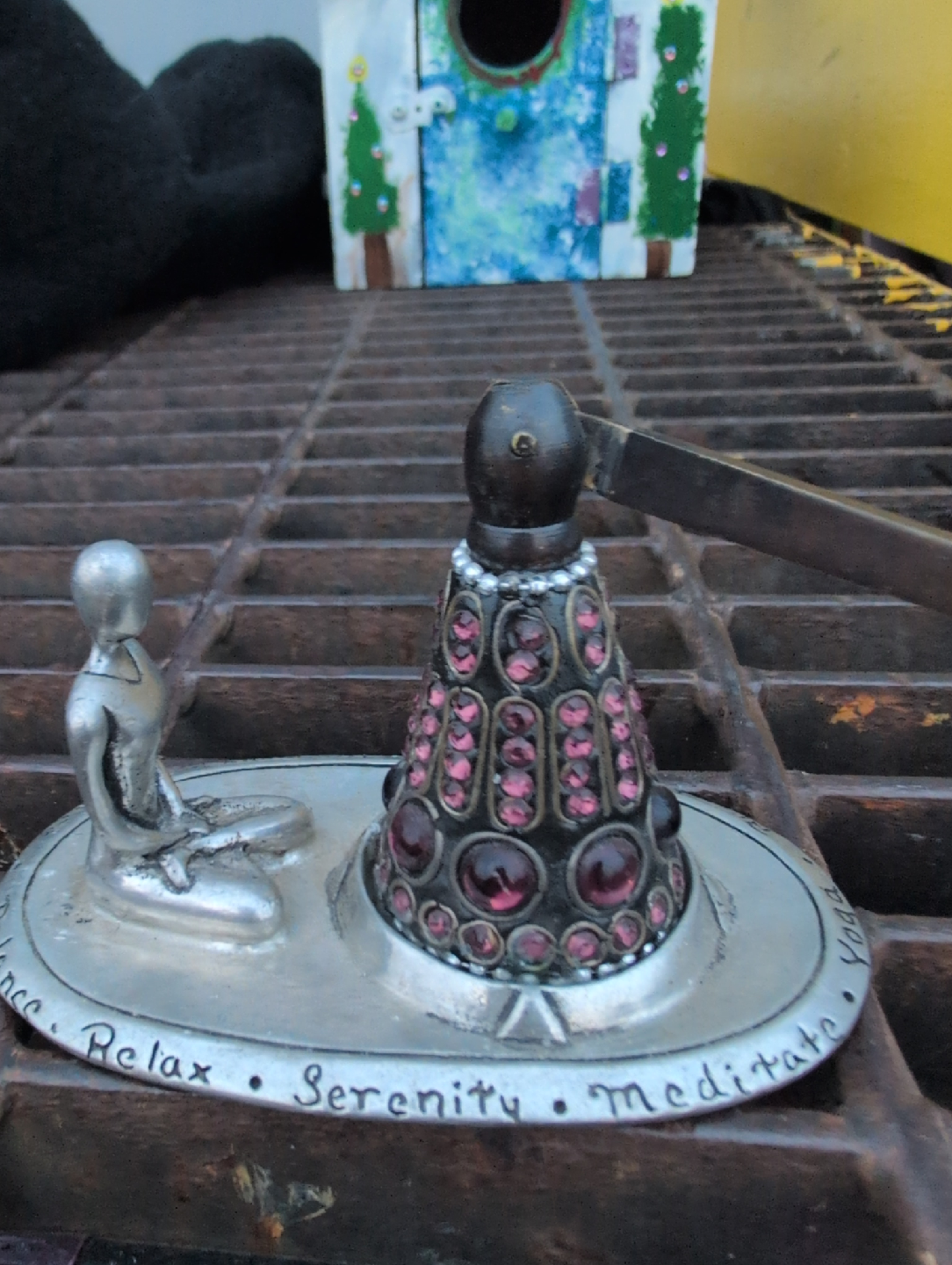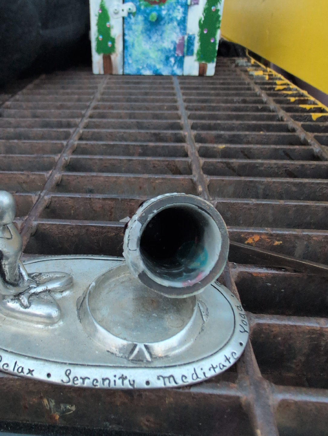 A unique statue featuring a meditating figure with the words Relax, Serenity, and Meditate around the base. It also has a yoga pose depicted on the side