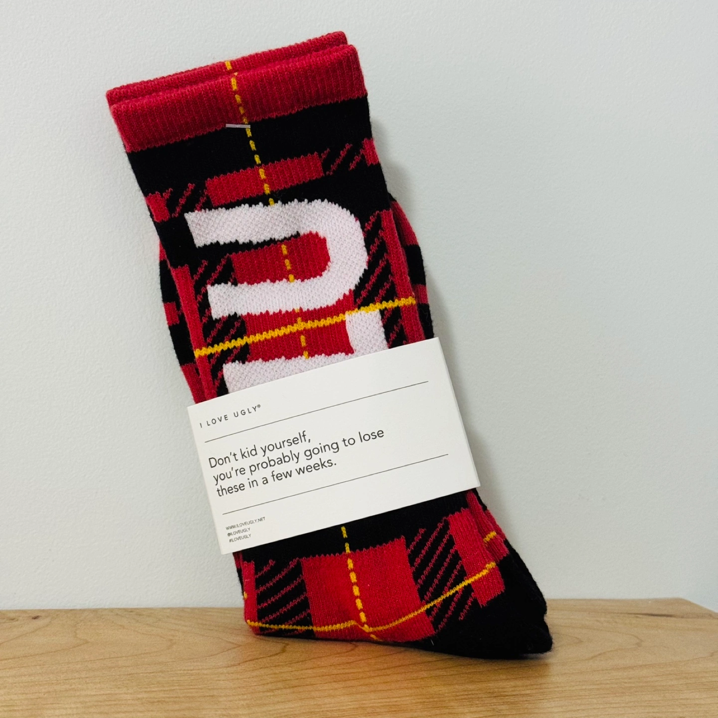 Selling brand new plaid socks from I Love Ugly. Brand new Still packaged together. Letters spell out ILU.