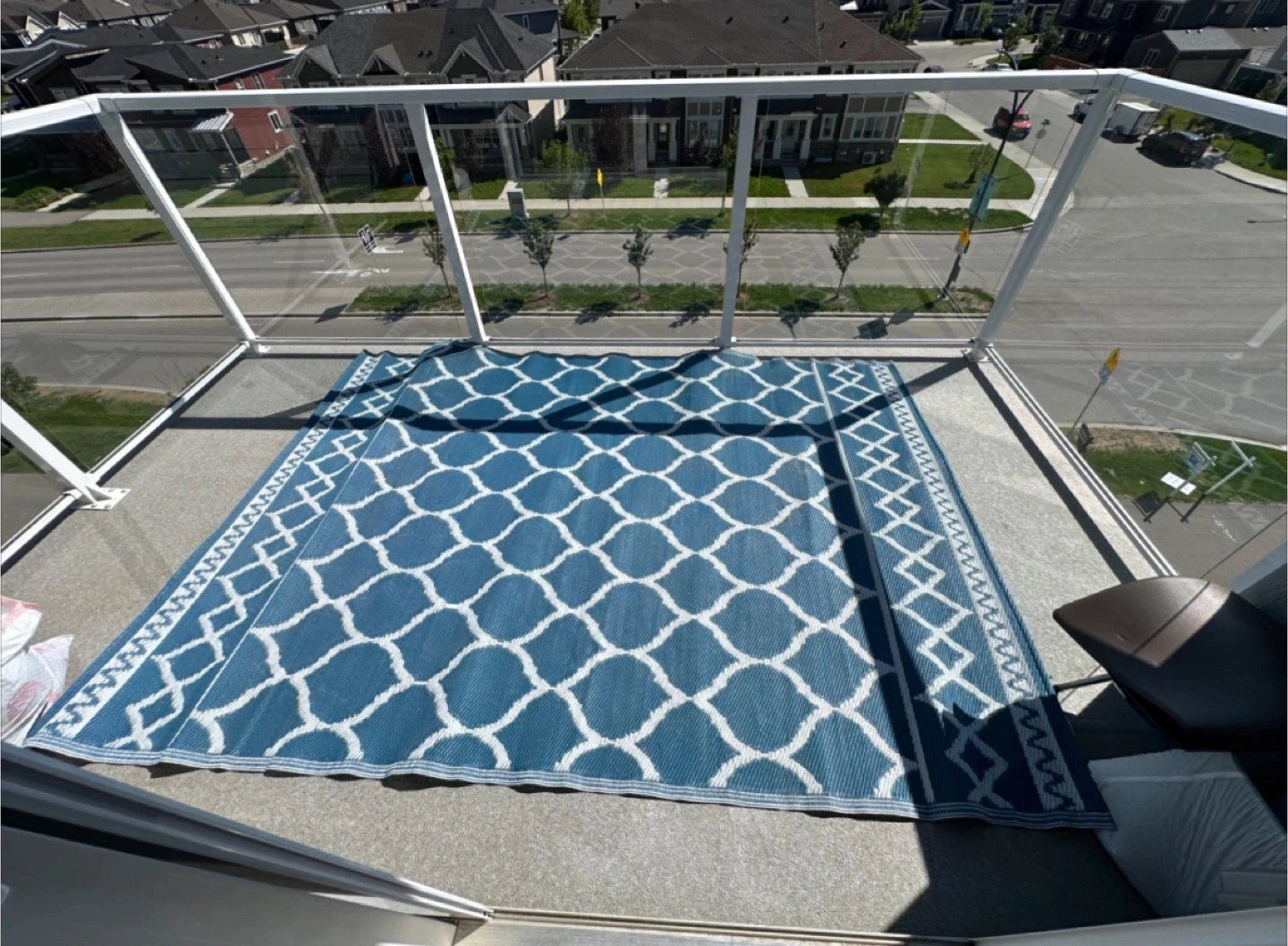Here's a nice blue and white outdoor rug, perfect for a balcony or patio! It has a cool geometric pattern that would look great in any outdoor space. It's in good condition and ready for a new home!