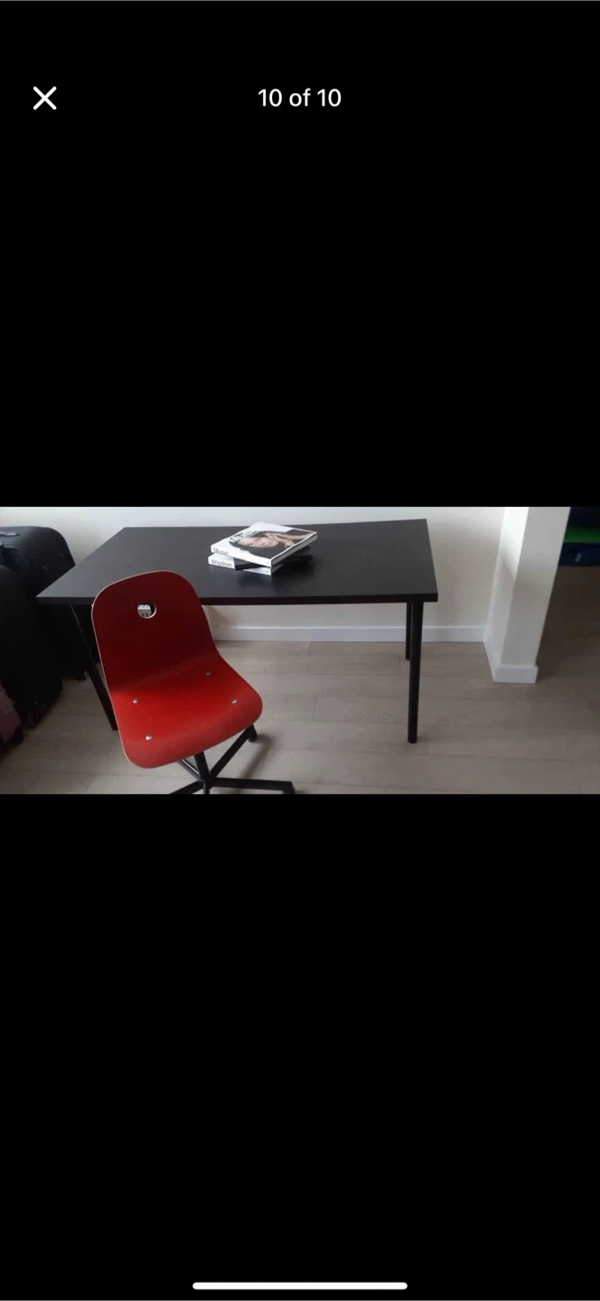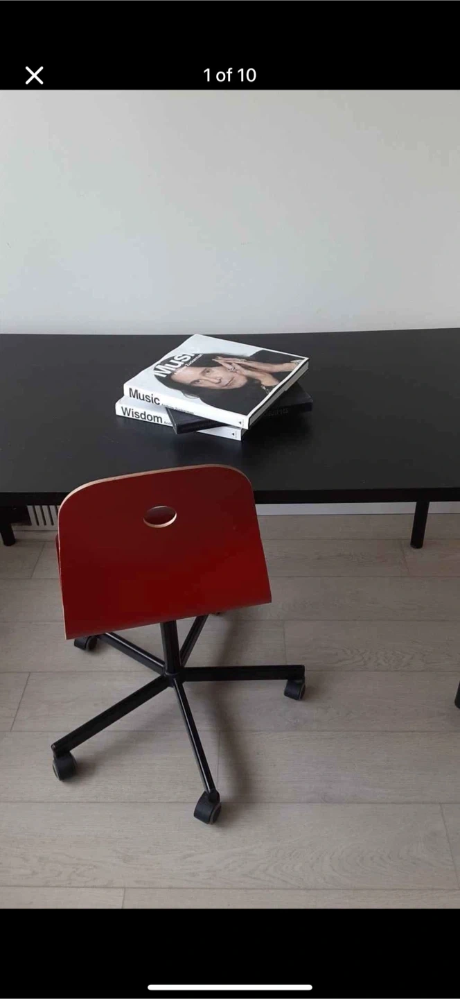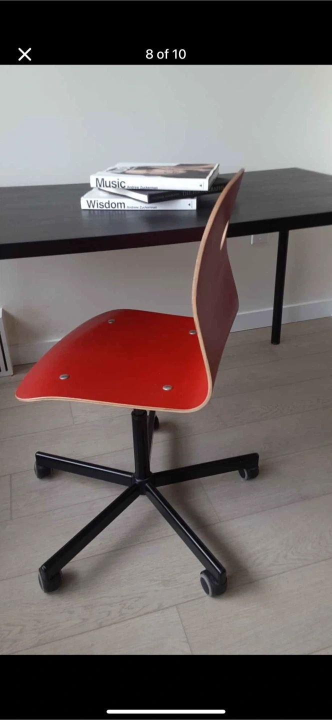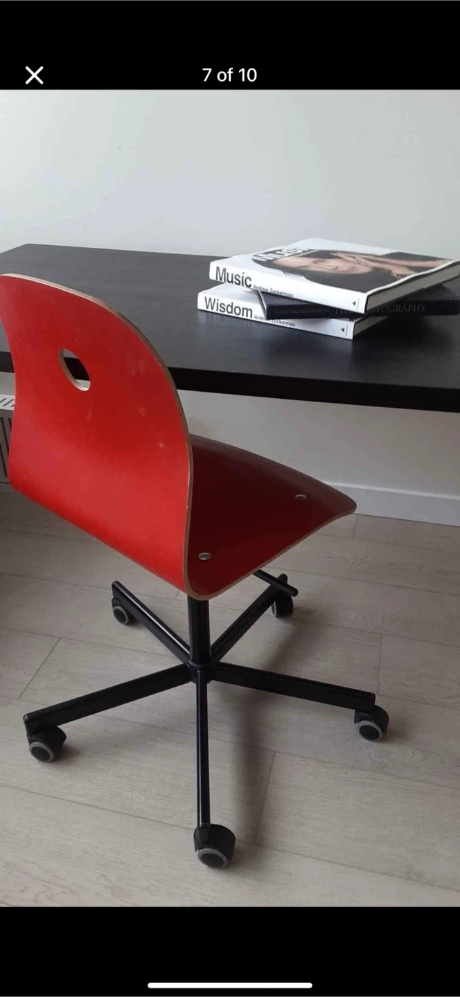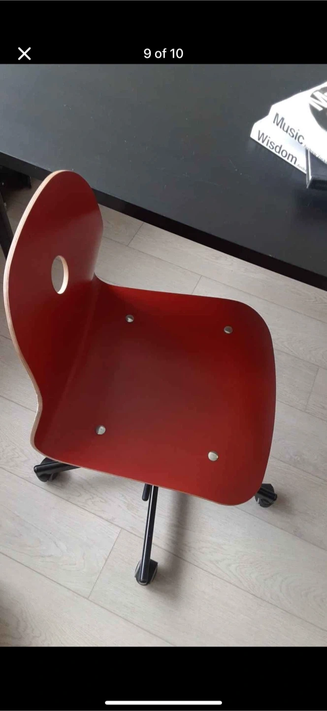 Selling a red office chair. It has a unique design with a hole in the back and a sturdy black base with wheels. Perfect for a home office or study space!