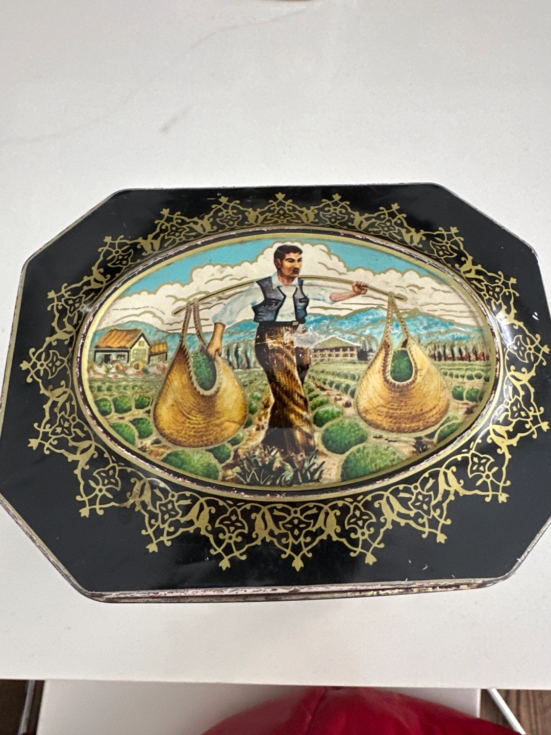 Octagonal shaped tin. Features colourful vintage artwork. Shows a man carrying sacks and a woman in traditional clothing. Likely used for tea storage. Shows some minor wear.