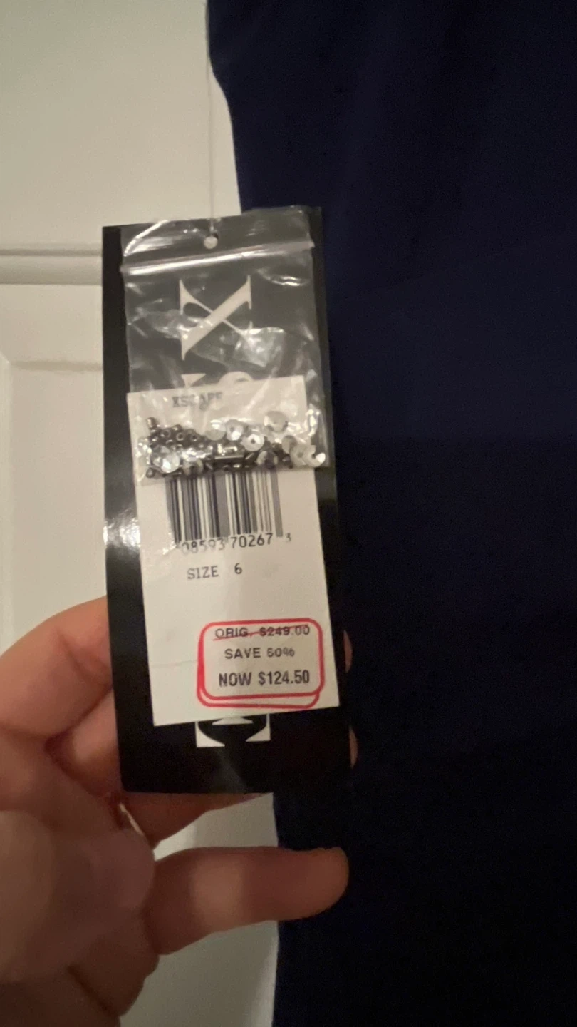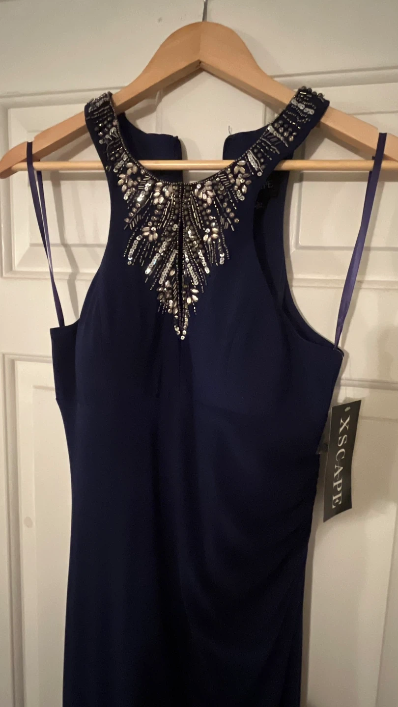 Gorgeous Xscape gown in a beautiful navy blue! It's a size 6 and features an elegant beaded neckline. Perfect for a special occasion!