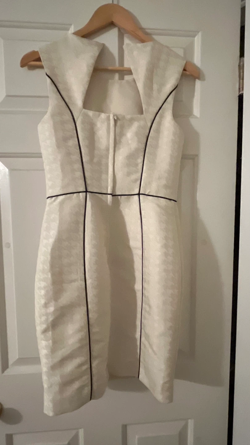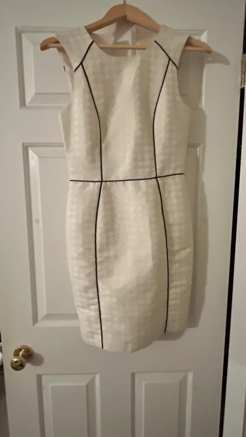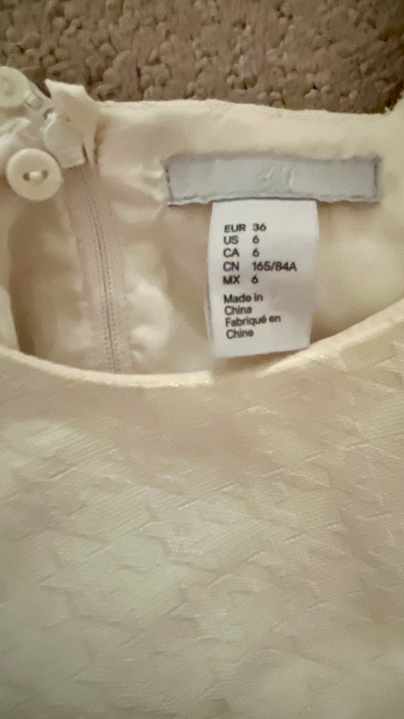 A lovely cream-coloured dress from H&M, perfect for any occasion! It's a size 6 and features a stylish design with black piping. The dress is in great condition and ready for a new home