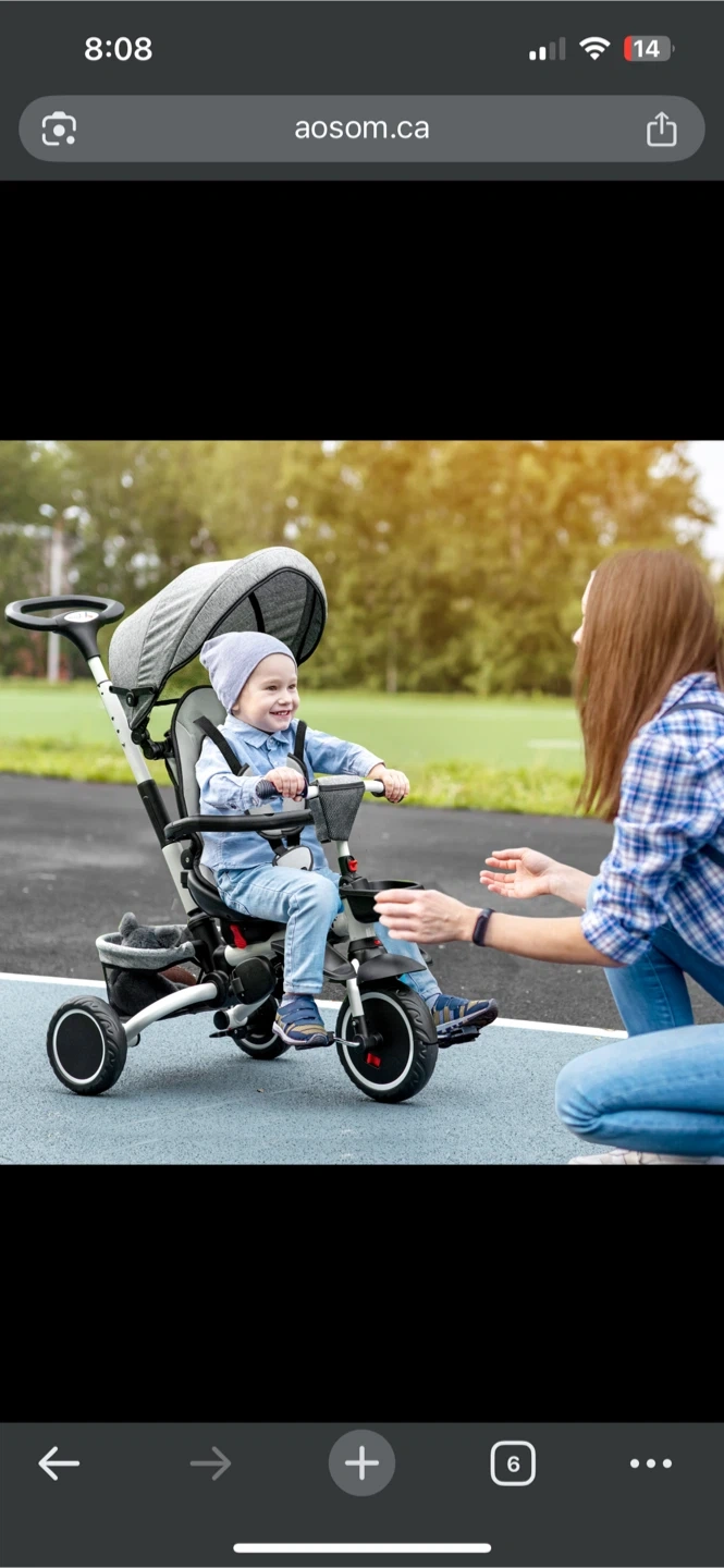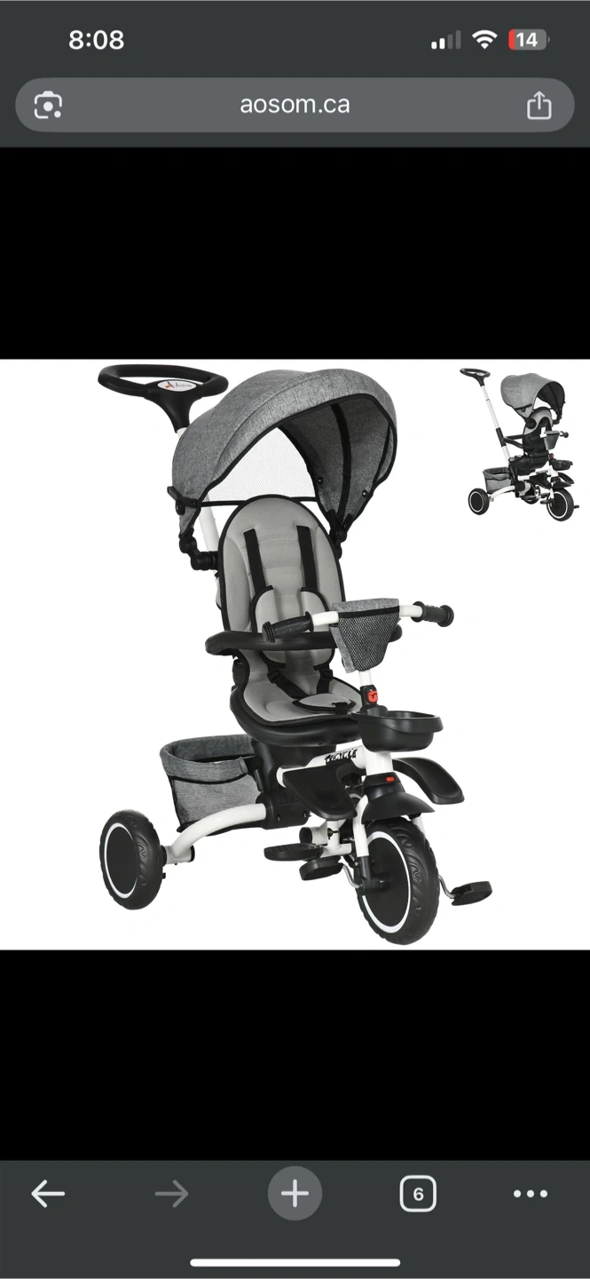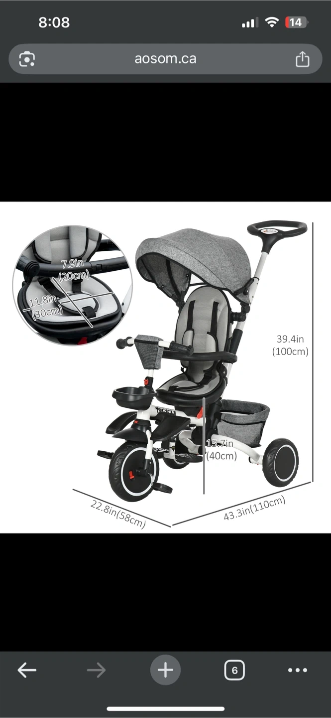 88Selling a like new aosom tricycle! It's in excellent condition and comes with all the original components in the box. Perfect for toddlers ready to explore. The tricycle is grey and white, and features a canopy for sun protection. It measures approximately 43.3 inches long and 39.4 inches high.