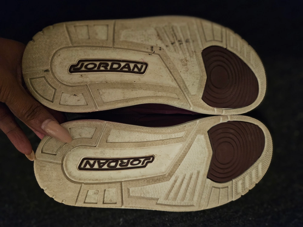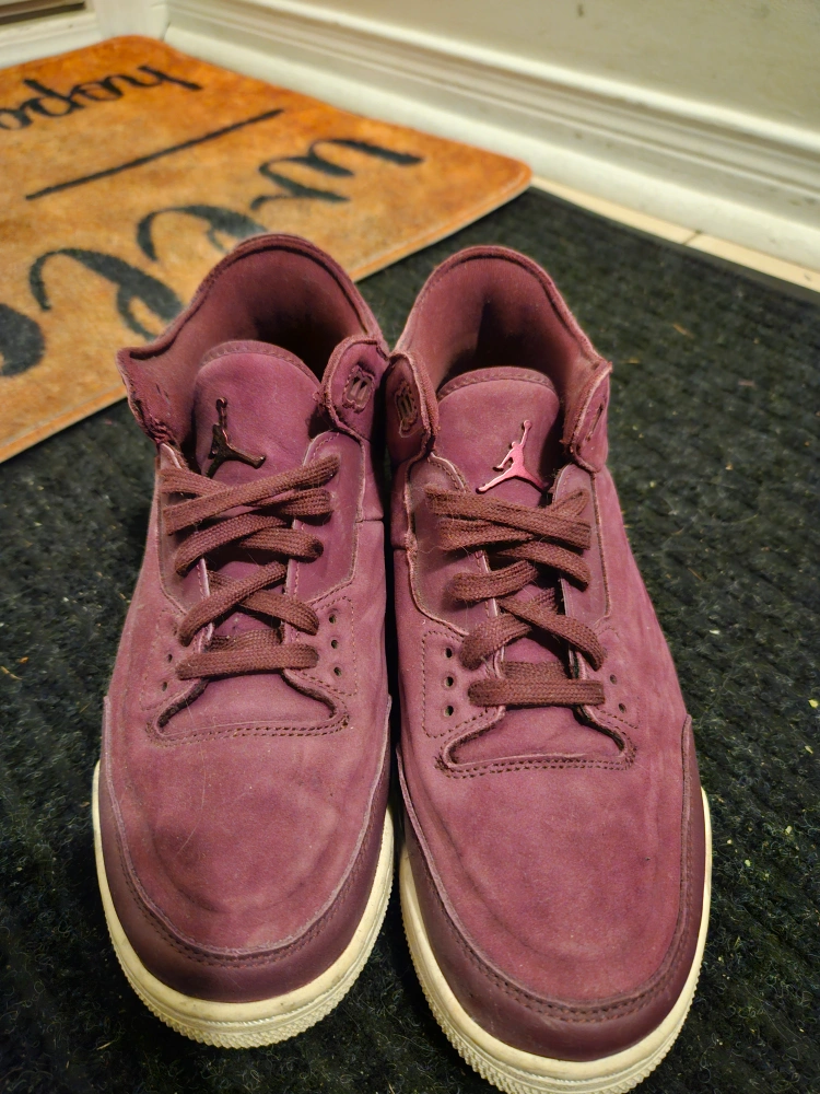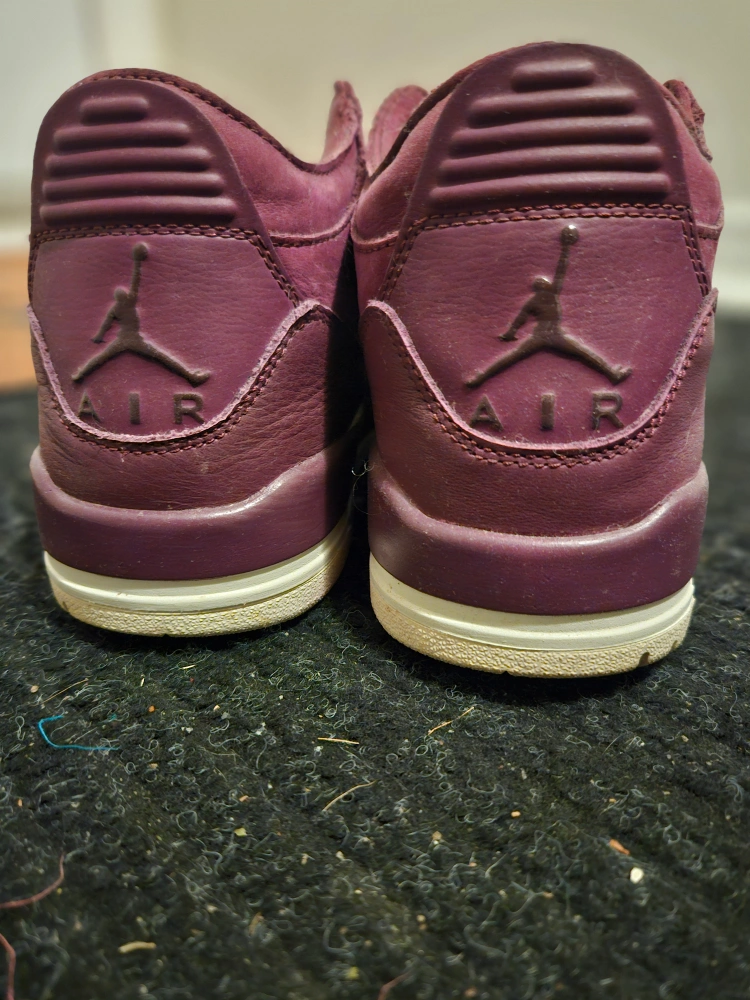 42Selling a pair of ladies Air Jordan 3 Retro in a beautiful bordeaux colour. They have the iconic Jumpman logo on the back and the soles show some wear, but overall they are in good condition.