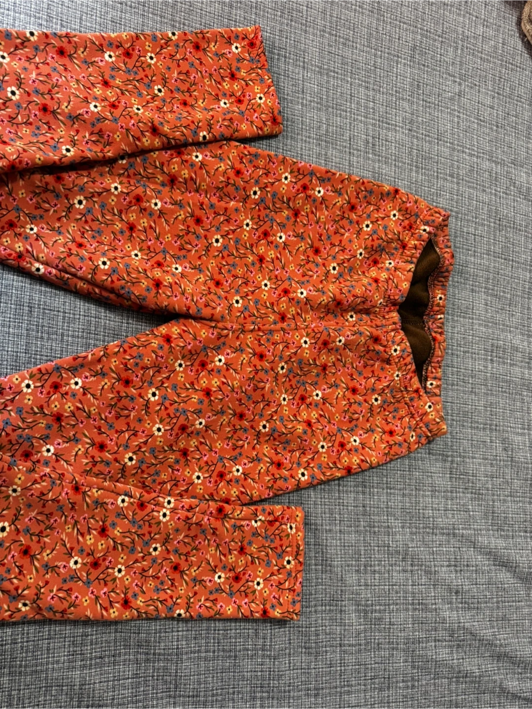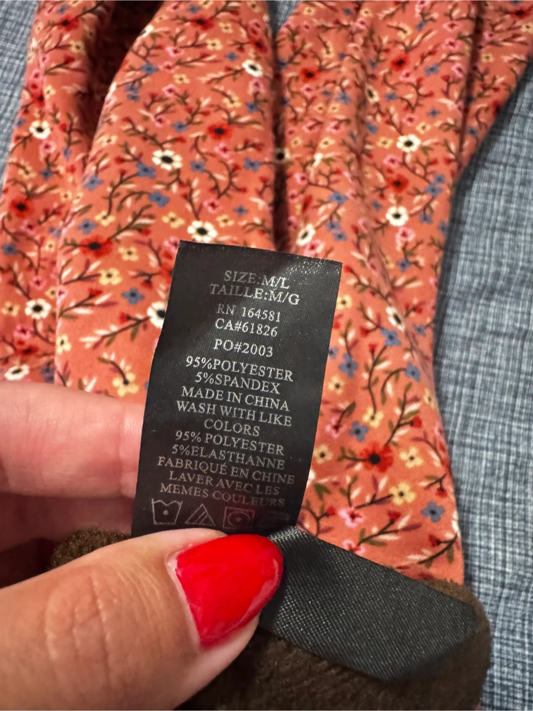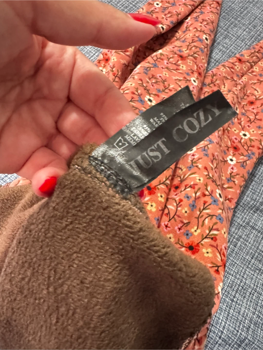 These leggings are from Just Cozy and feature a cute floral print. They are a size M/L and made of 95% polyester and 5% spandex, making them super comfy and stretchy!