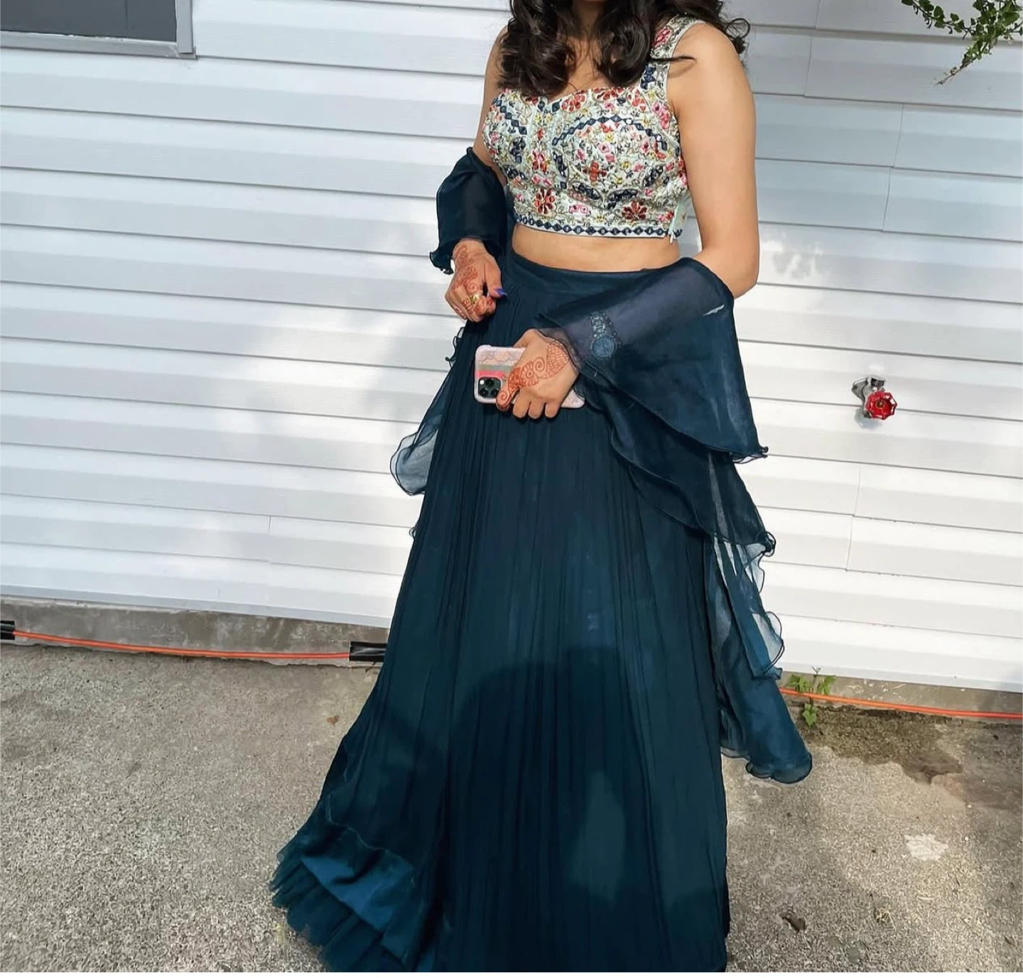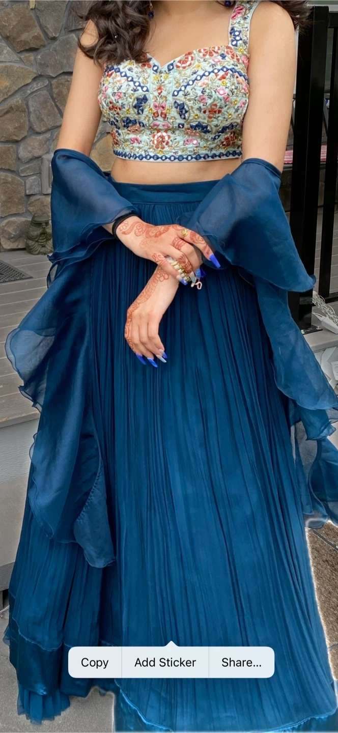 Beautiful blue lehenga choli set, perfect for a special occasion! The skirt has lovely pleats and a layered design, and the top is intricately designed with colourful embroidery. The set also comes with a matching dupatta.