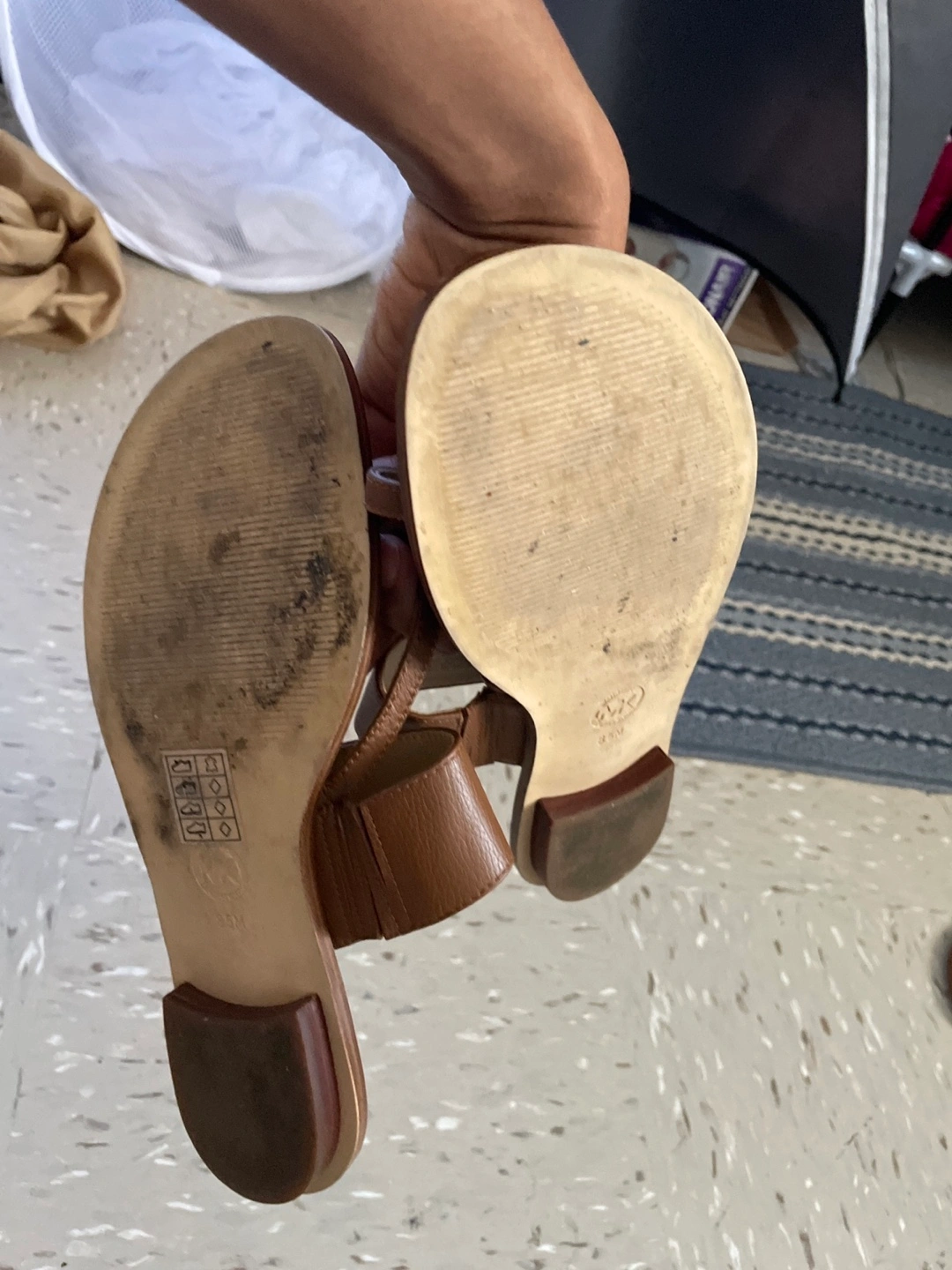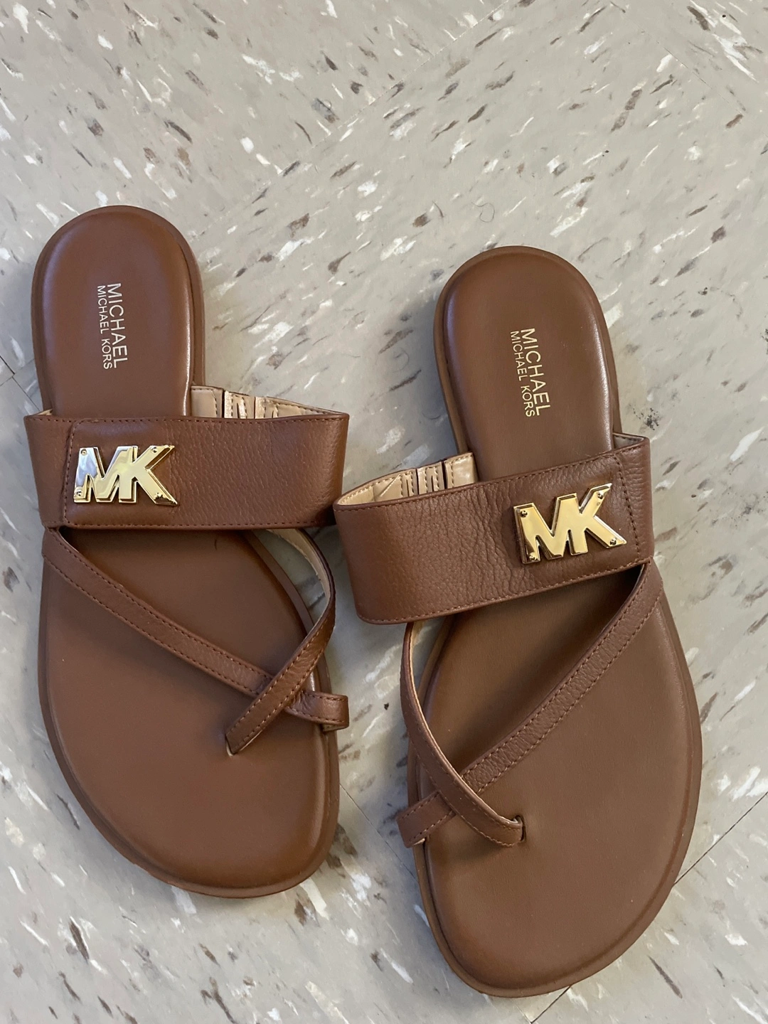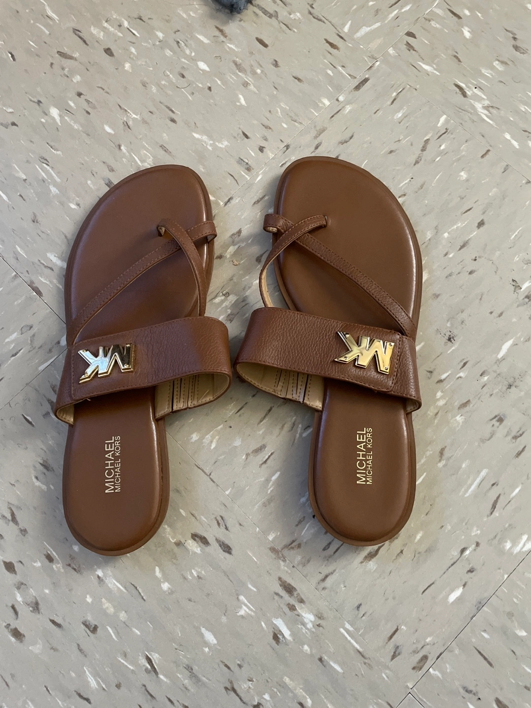 These are Michael Kors brown sandals. They show some signs of wear on the soles, but the uppers are in good condition. They have the MK logo on the front strap. Great for summer!