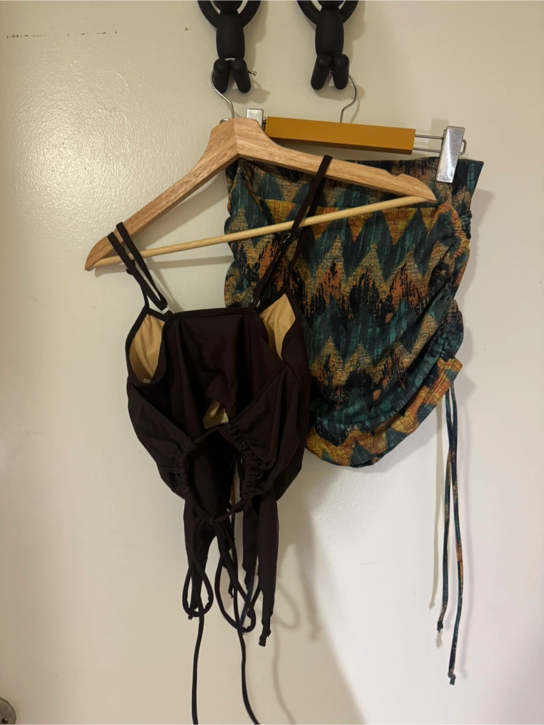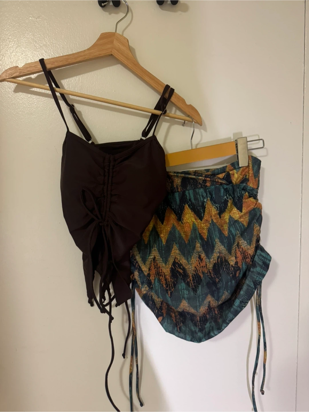 Cute two-piece set! It includes a brown top with tie details and a patterned skirt with drawstring sides. The skirt has a unique zigzag design in shades of green, orange, and brown. Perfect for summer! I wore it just once