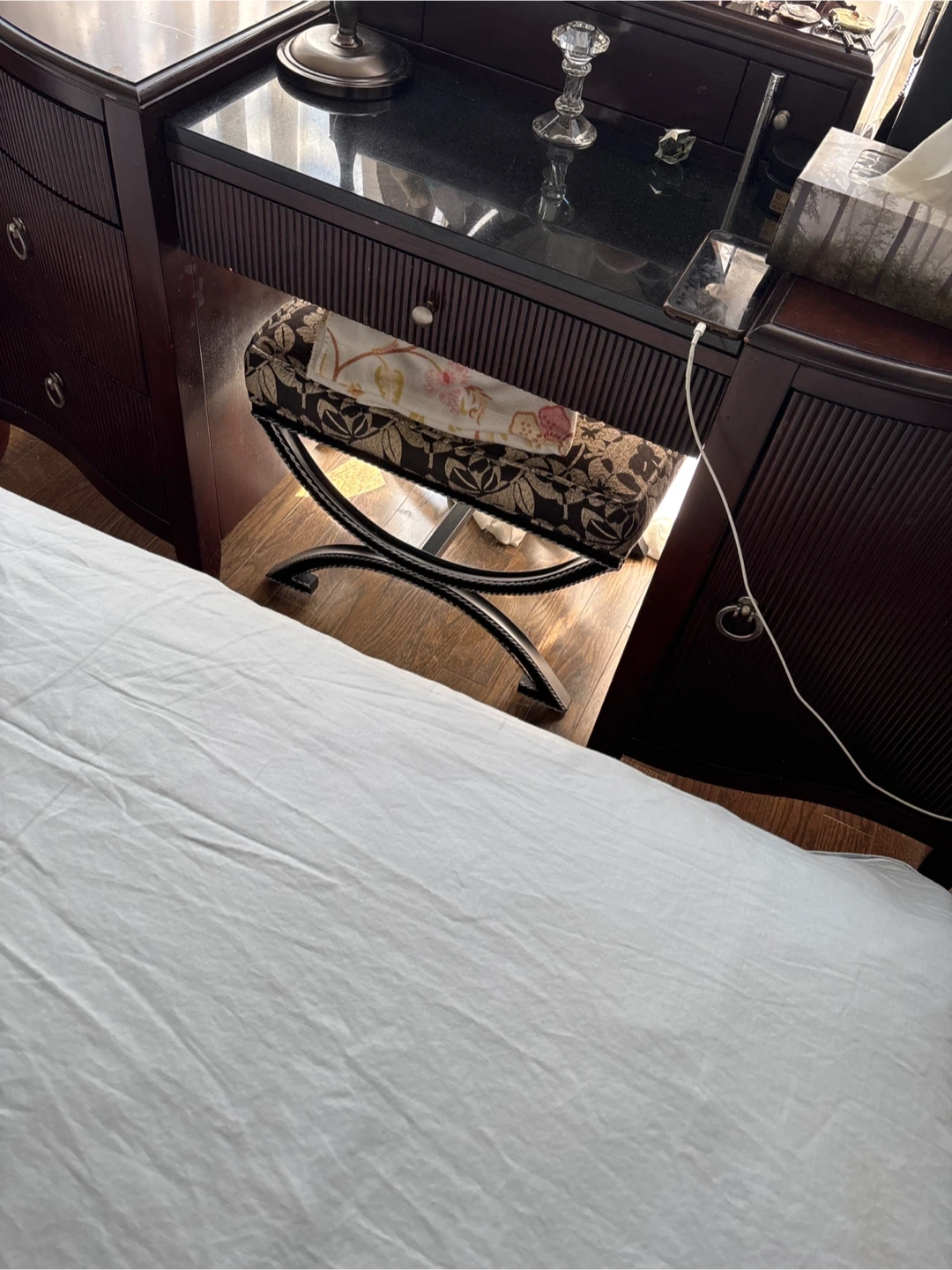 Selling a bedroom set including a Queen size bed frame, two nightstands, and a vanity with a mirror plus drawer. The set is in good condition, made out of solid wood, and would be a lovely addition to any bedroom. Please message me if you're interested!