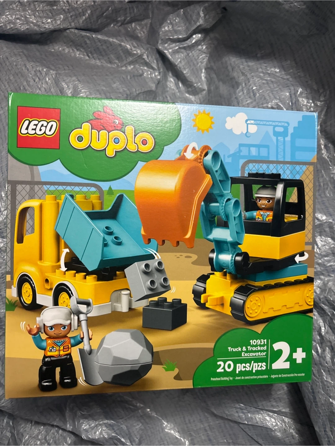 Selling a LEGO Duplo set, number 10931, which includes a truck and tracked excavator! It's designed for ages 2+ and includes 20 pieces. Great for developing fine motor skills and imagination. Comes with the original box