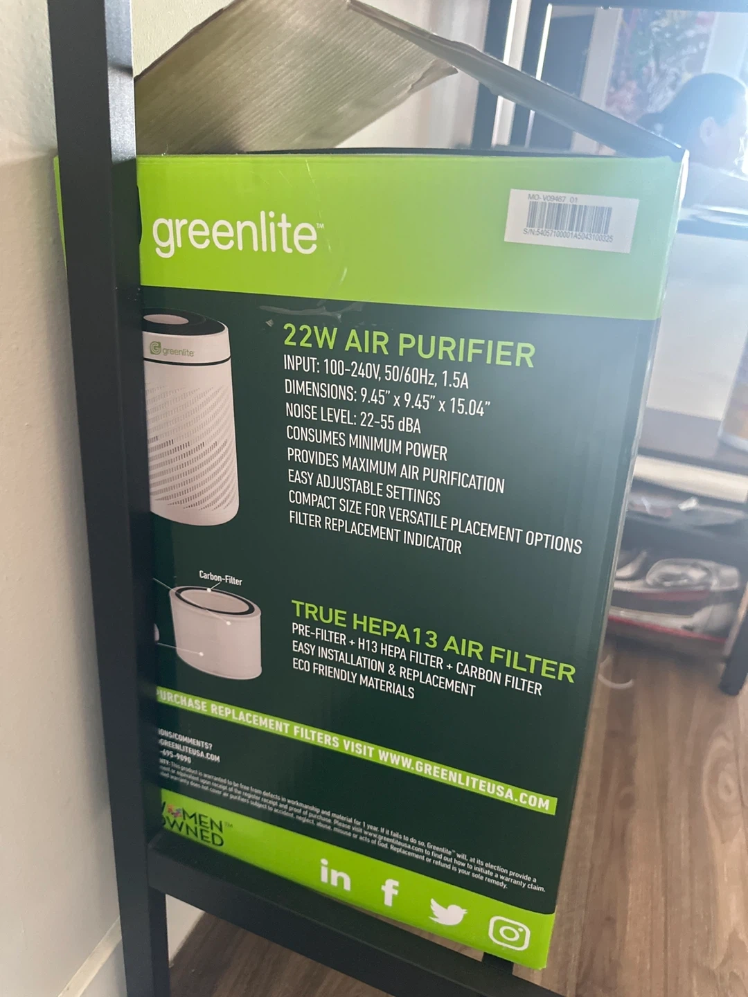 Selling a Greenlite 22W air purifier. It has a true HEPA 13 air filter, which includes a pre-filter, H13 HEPA filter, and a carbon filter. Key features include: - Easy installation and replacement - Eco-friendly materials - Compact size for versatile placement options - Filter replacement indicator Dimensions: 9.45" x 9.45" x 15.04" ๐ฅ