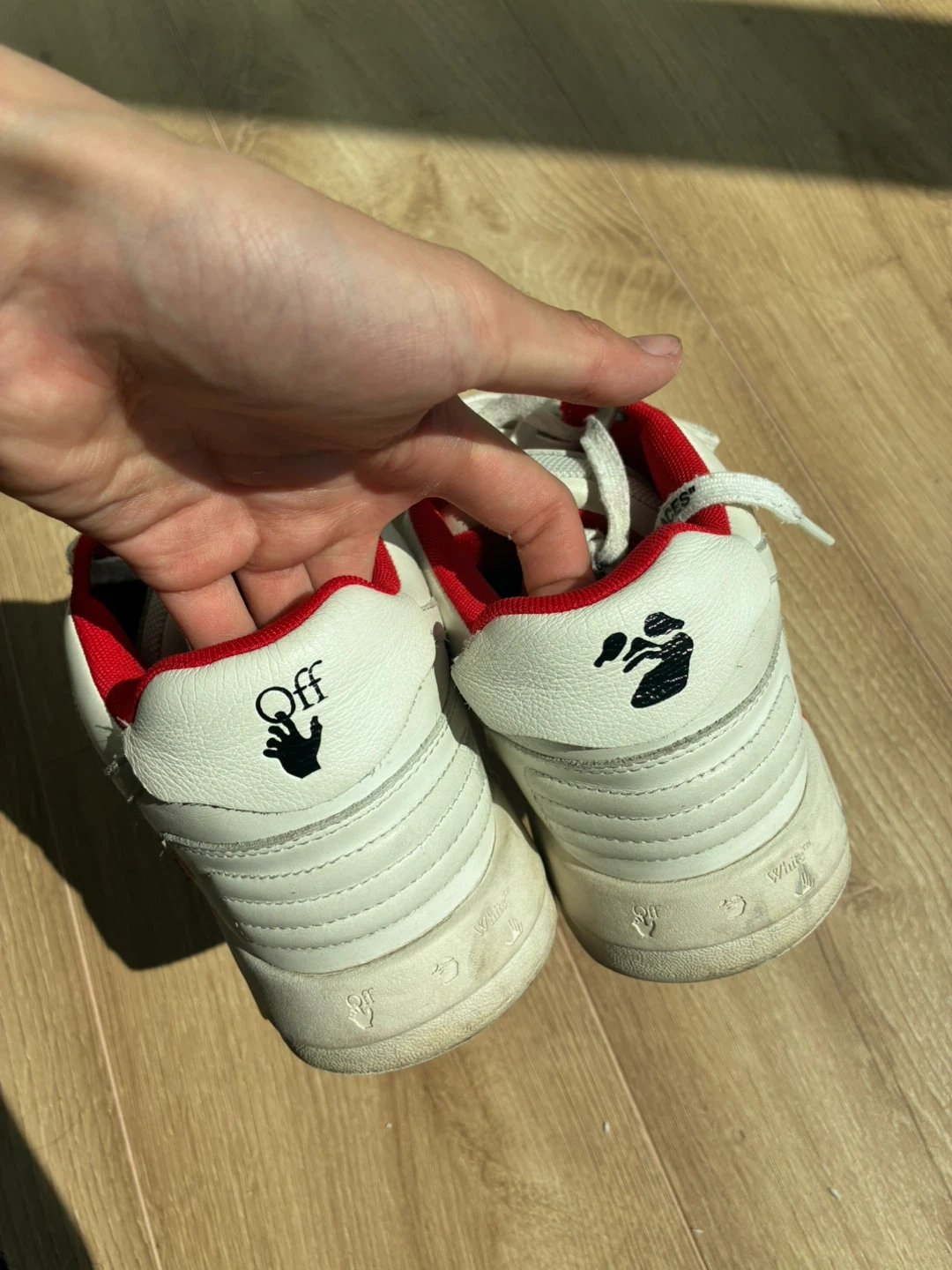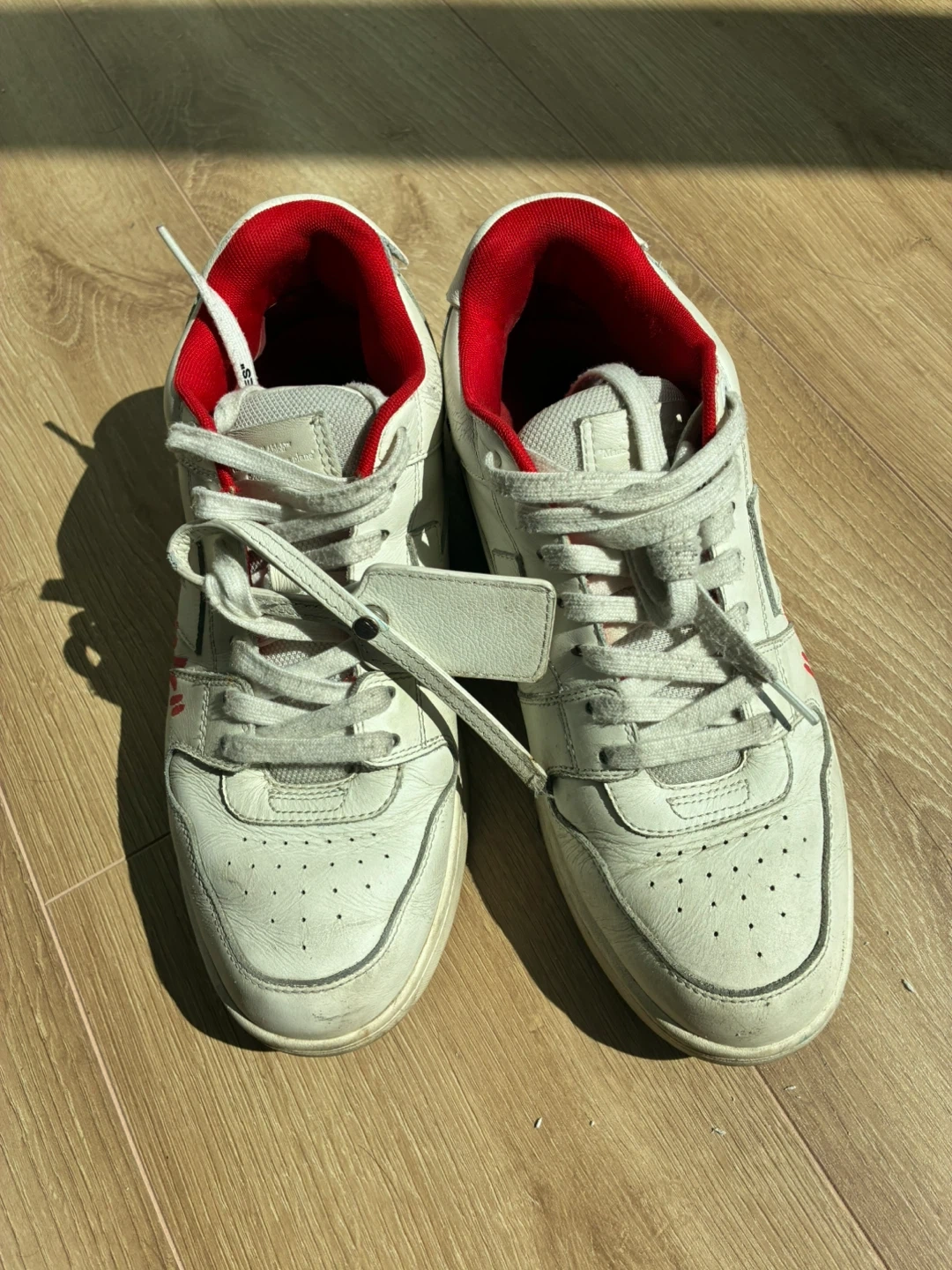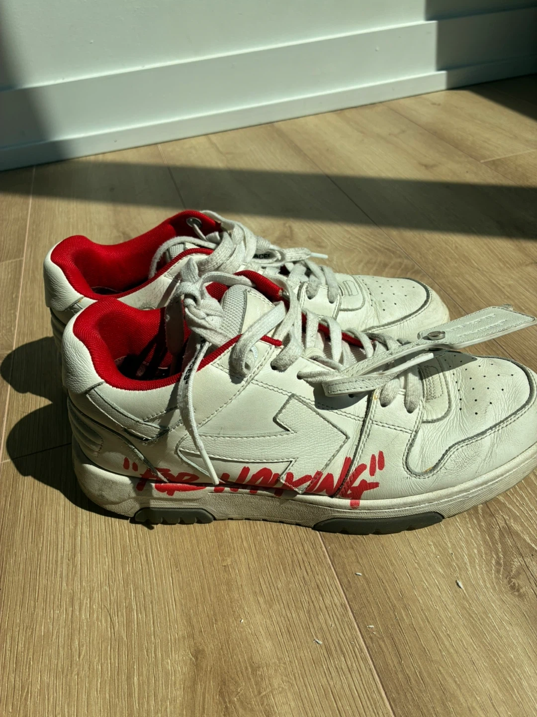 104Selling a pair of Off-White sneakers with the "For Walking" design. These are white with red accents and show some signs of wear. Please see the photos for details! size us 10 men