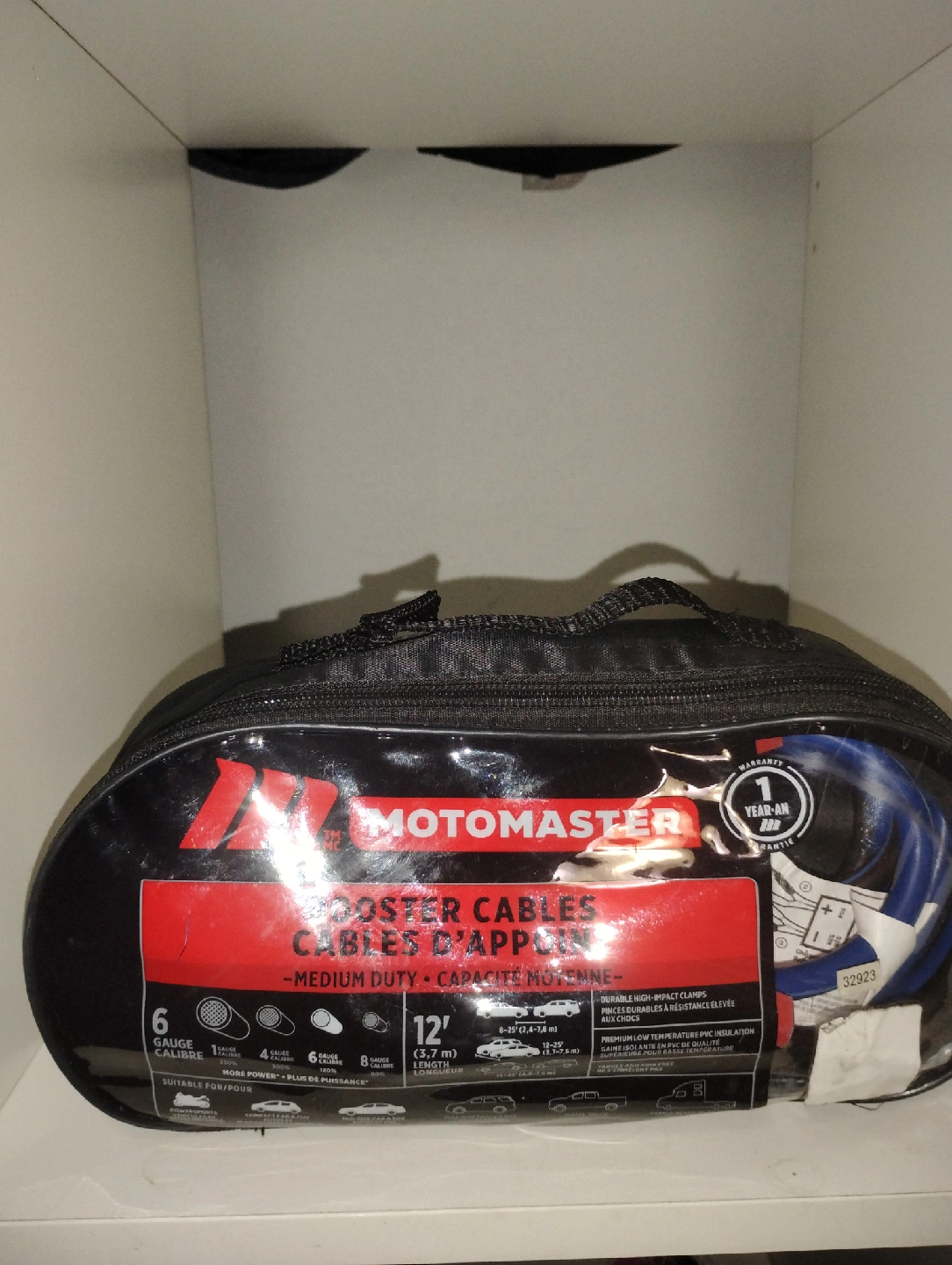 Selling a set of MotoMaster booster cables. These are medium-duty cables and come in their original carrying bag. The cables are 12 feet (3.7m) in length and are 6 gauge.
