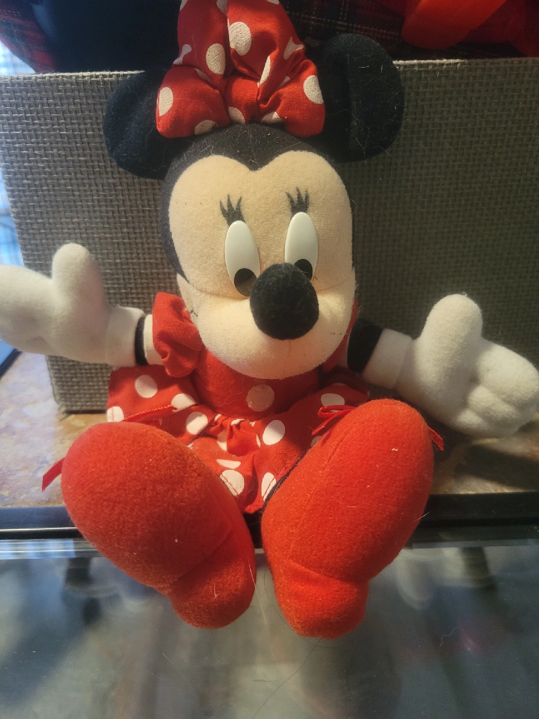 This is a cute Minnie Mouse plush toy! She's wearing a red dress with white polka dots and a matching bow. She's in great condition and ready for a new home