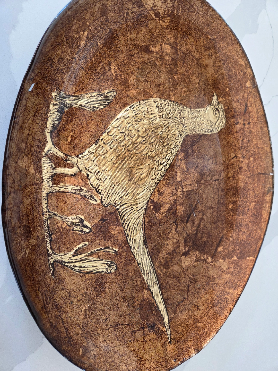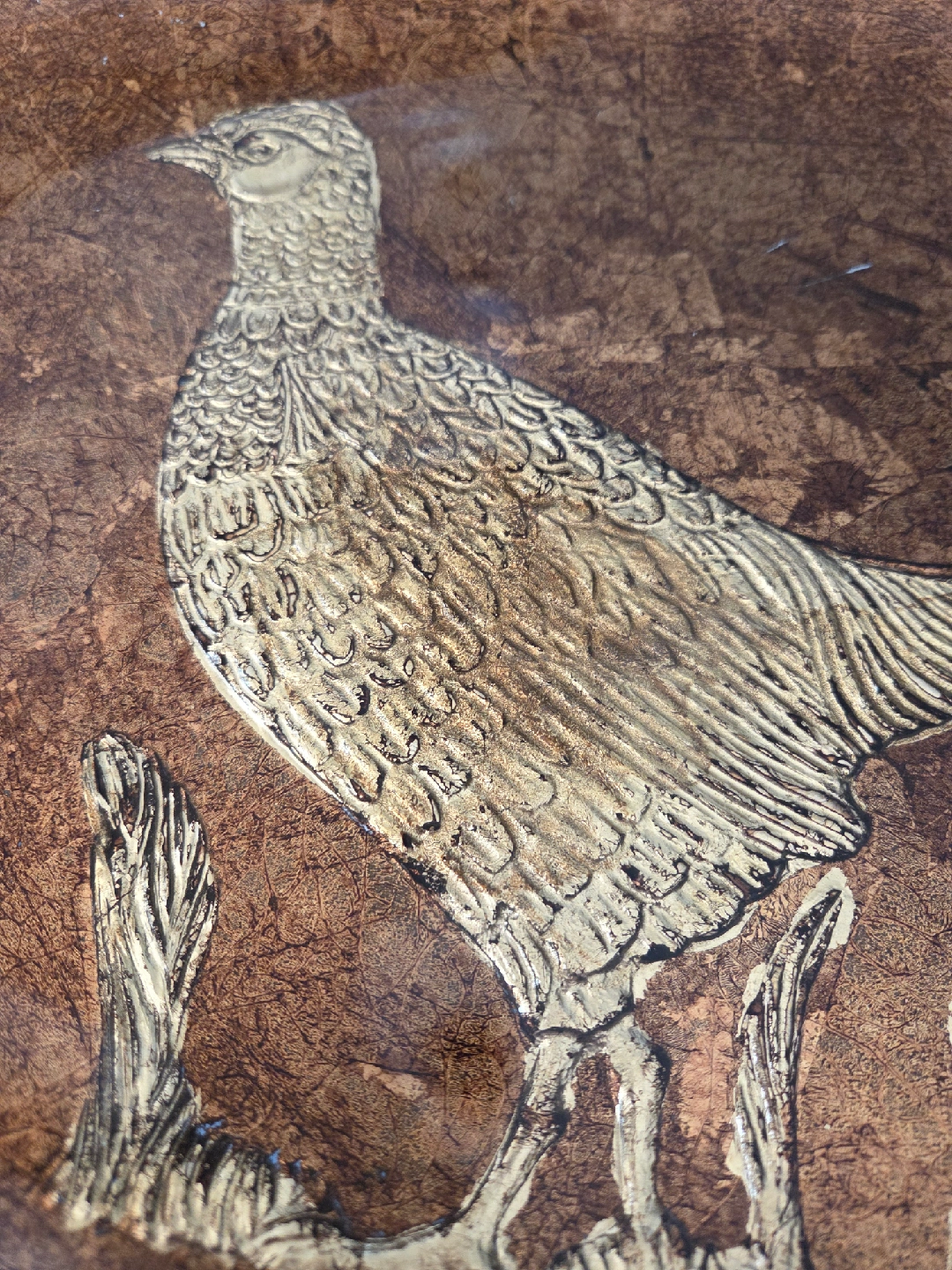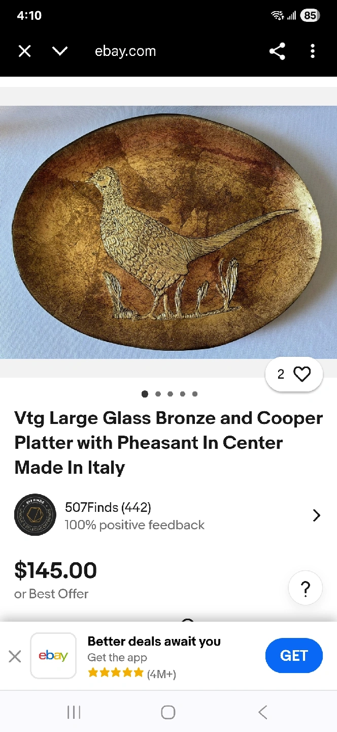 Selling a vintage large glass platter with a bronze and cooper pheasant design in the center. It was made in Italy and has a beautiful, unique look! I saw a similar one online listed for $145
