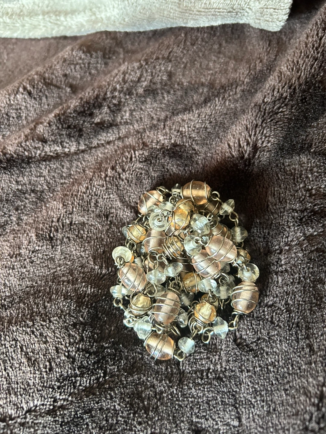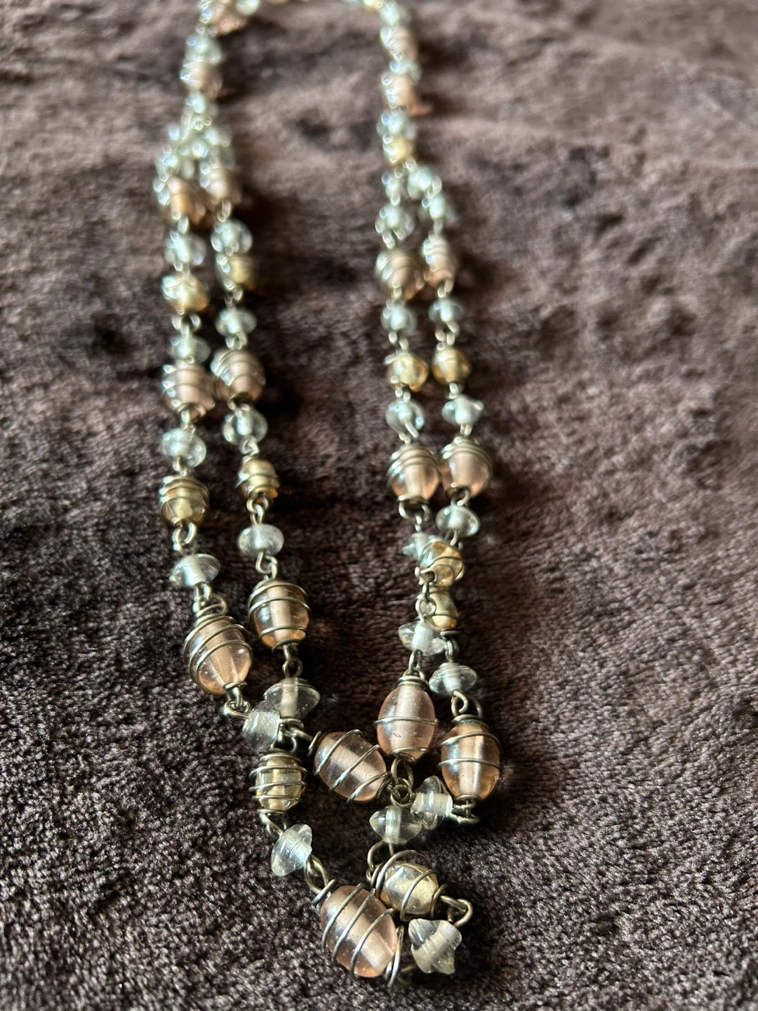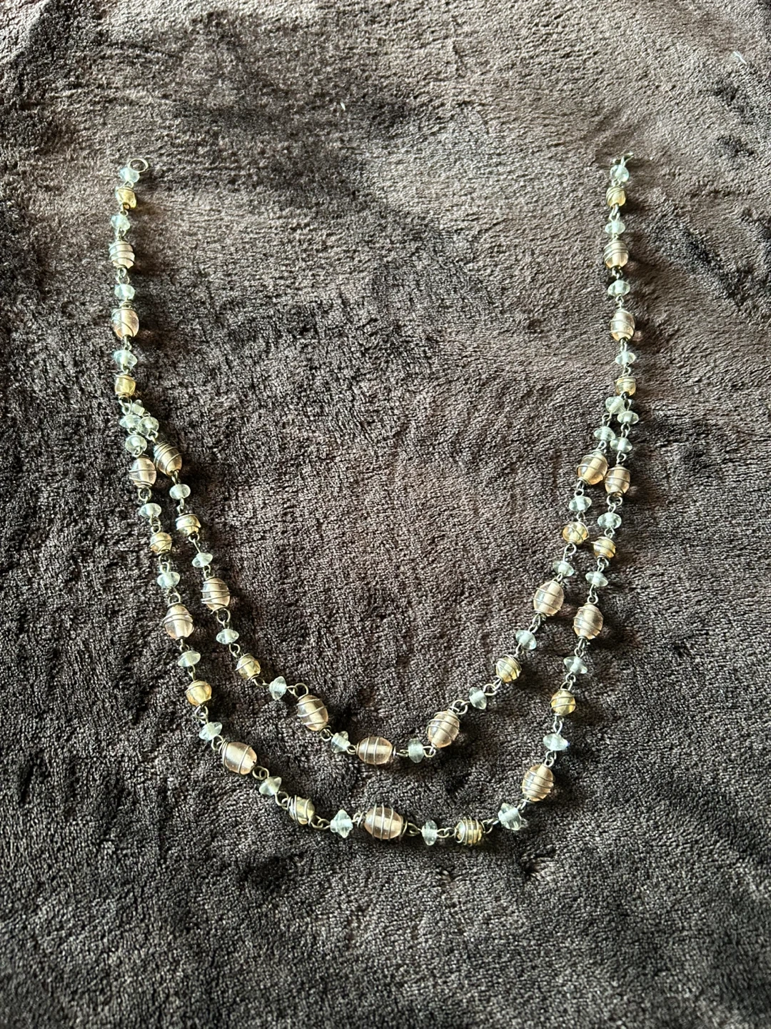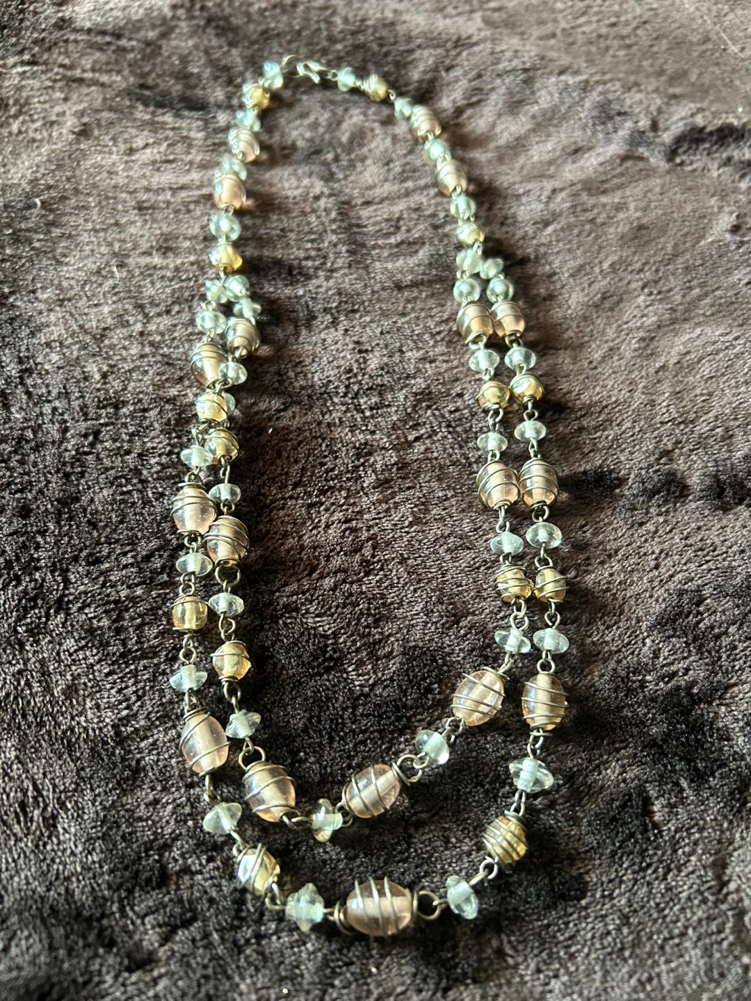 237This is a beautiful beaded necklace with a mix of silver, gold, light bronze and clear beads. It's in great condition and would be a lovely addition to any outfit