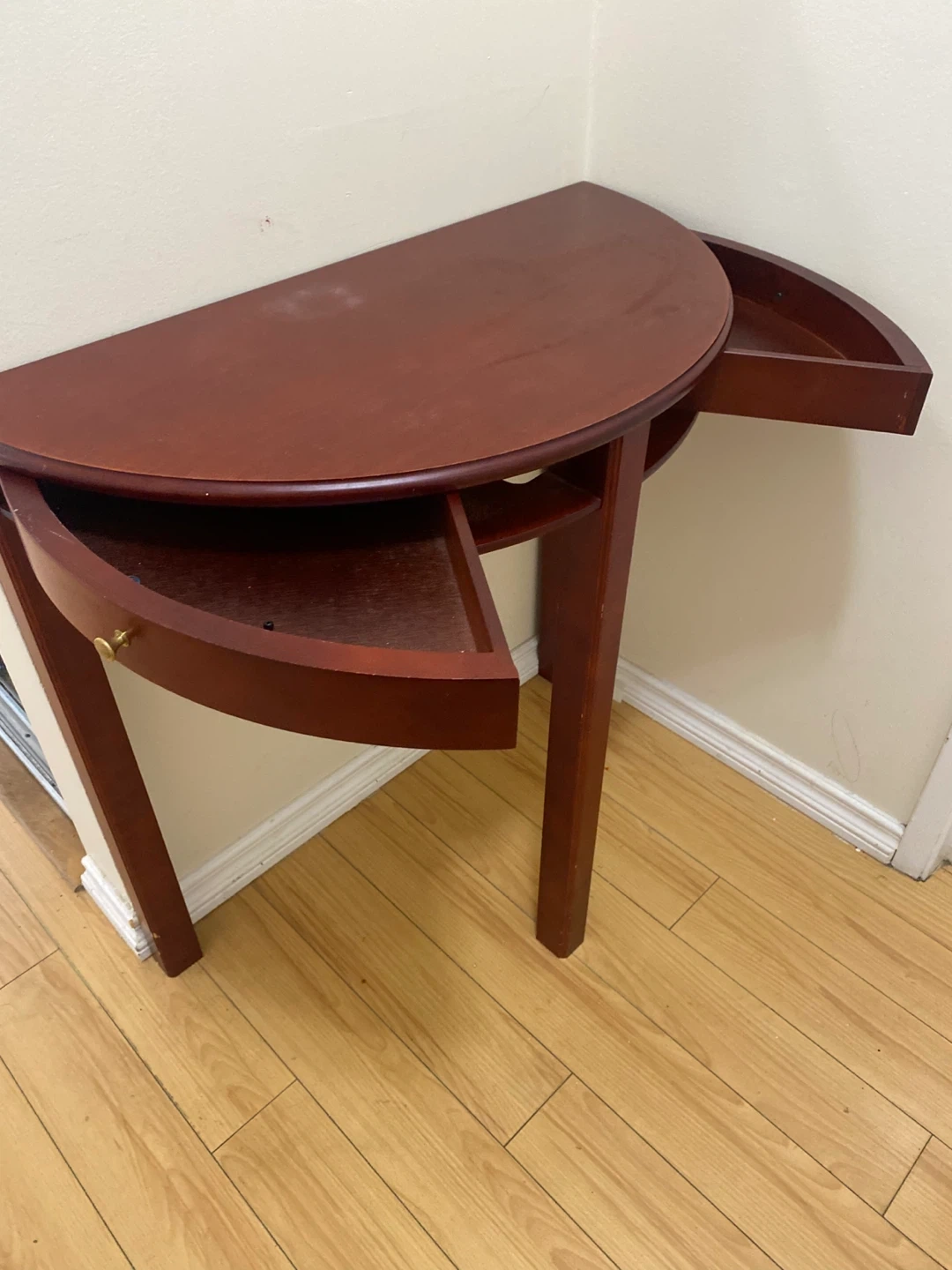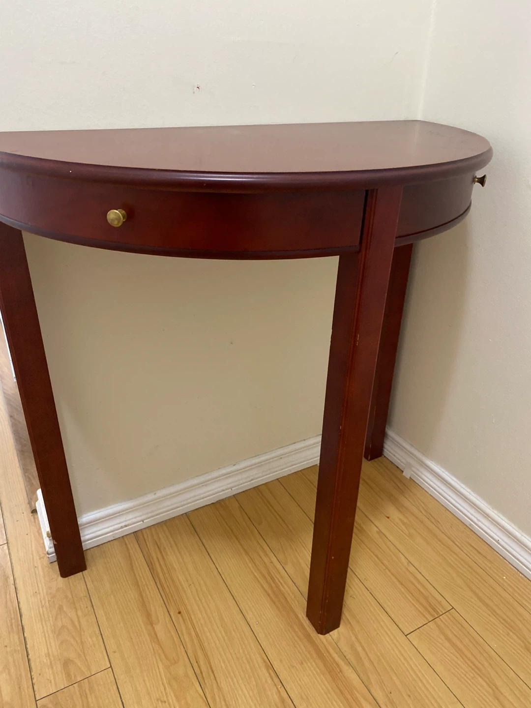 Selling a lovely half-moon shaped entryway table. It's a beautiful mahogany colour and perfect for small spaces. It features a drawer for storage , it’s in decent condition. Best for the entrance hallway to keep keys, cards etc