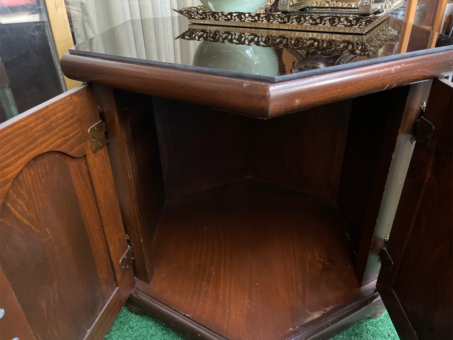 Selling a real wood cabinet/sturdy side table with a glass top. It has a unique design on the front doors and brass handles. Two-door cabinet. Dark brown wood finish. Good for storage. Perfect for an elegance to any room!
